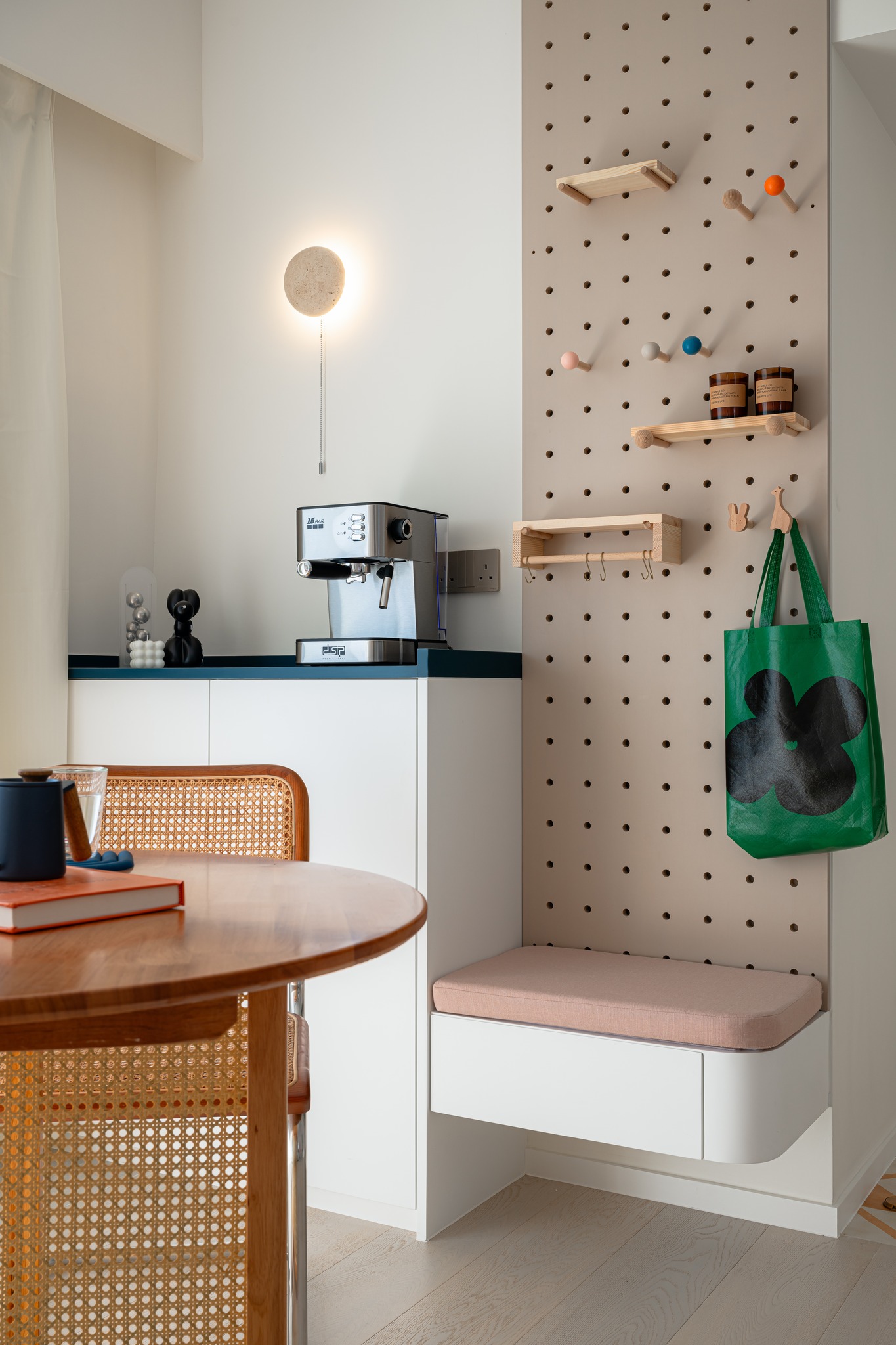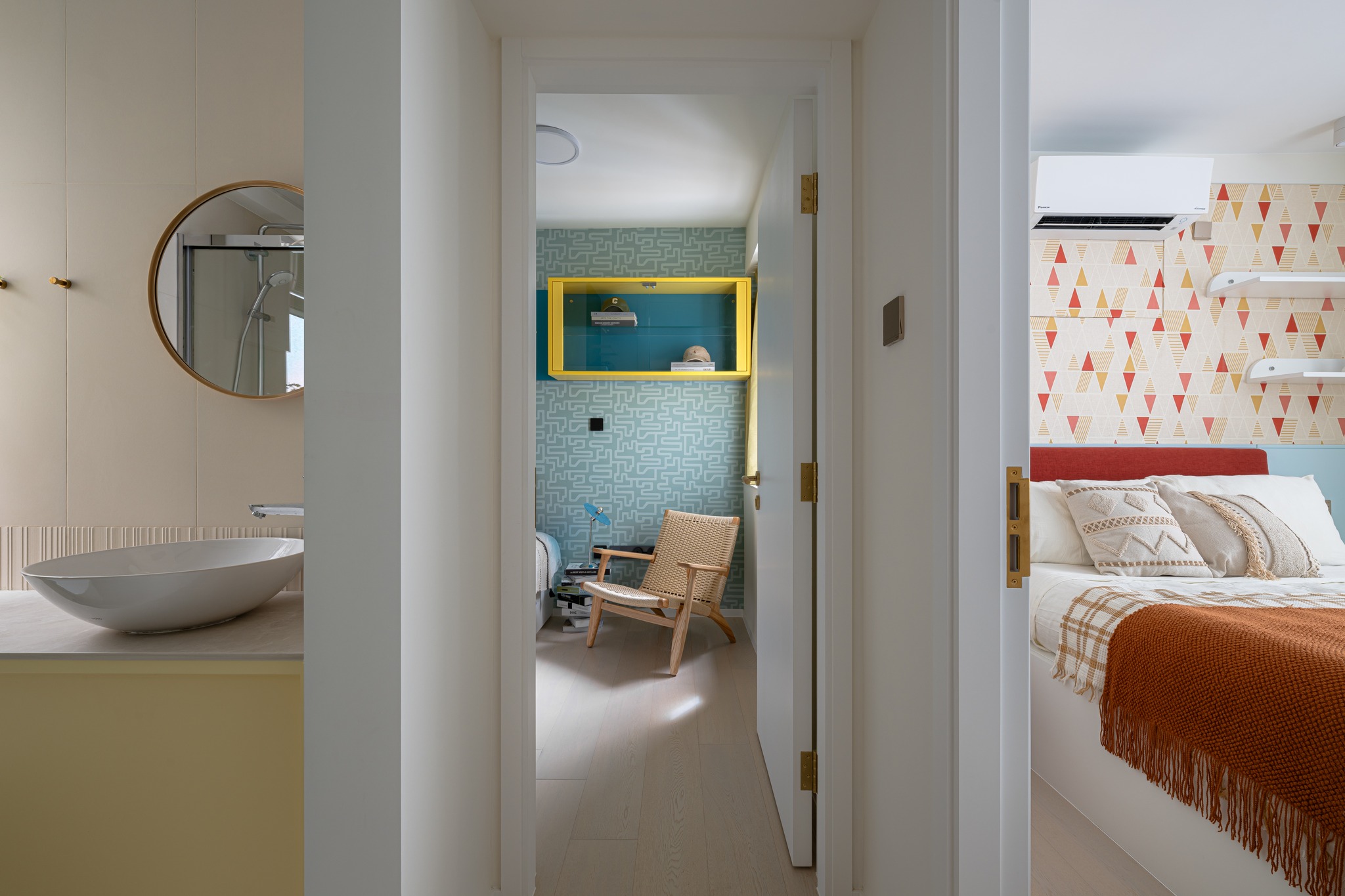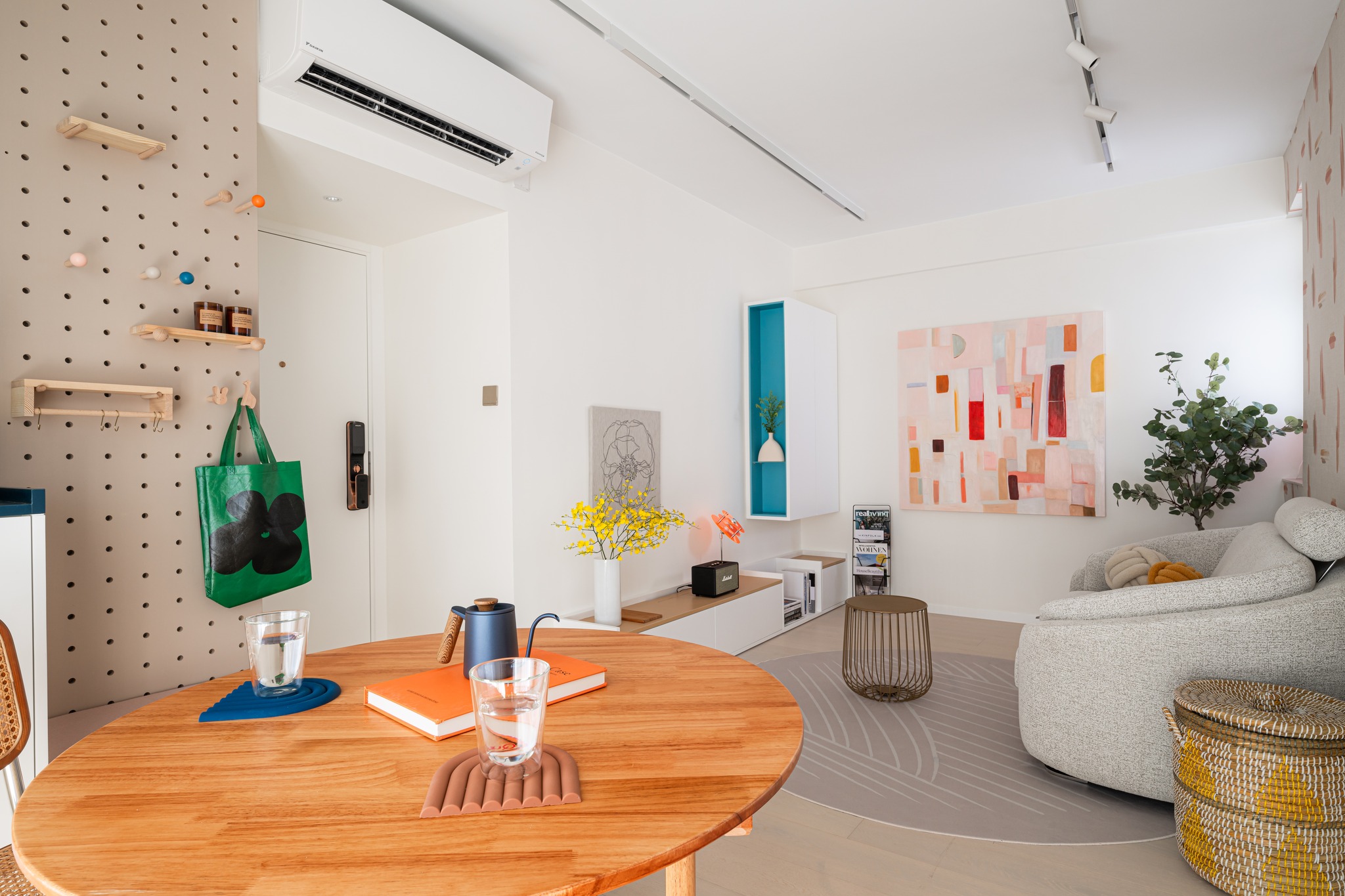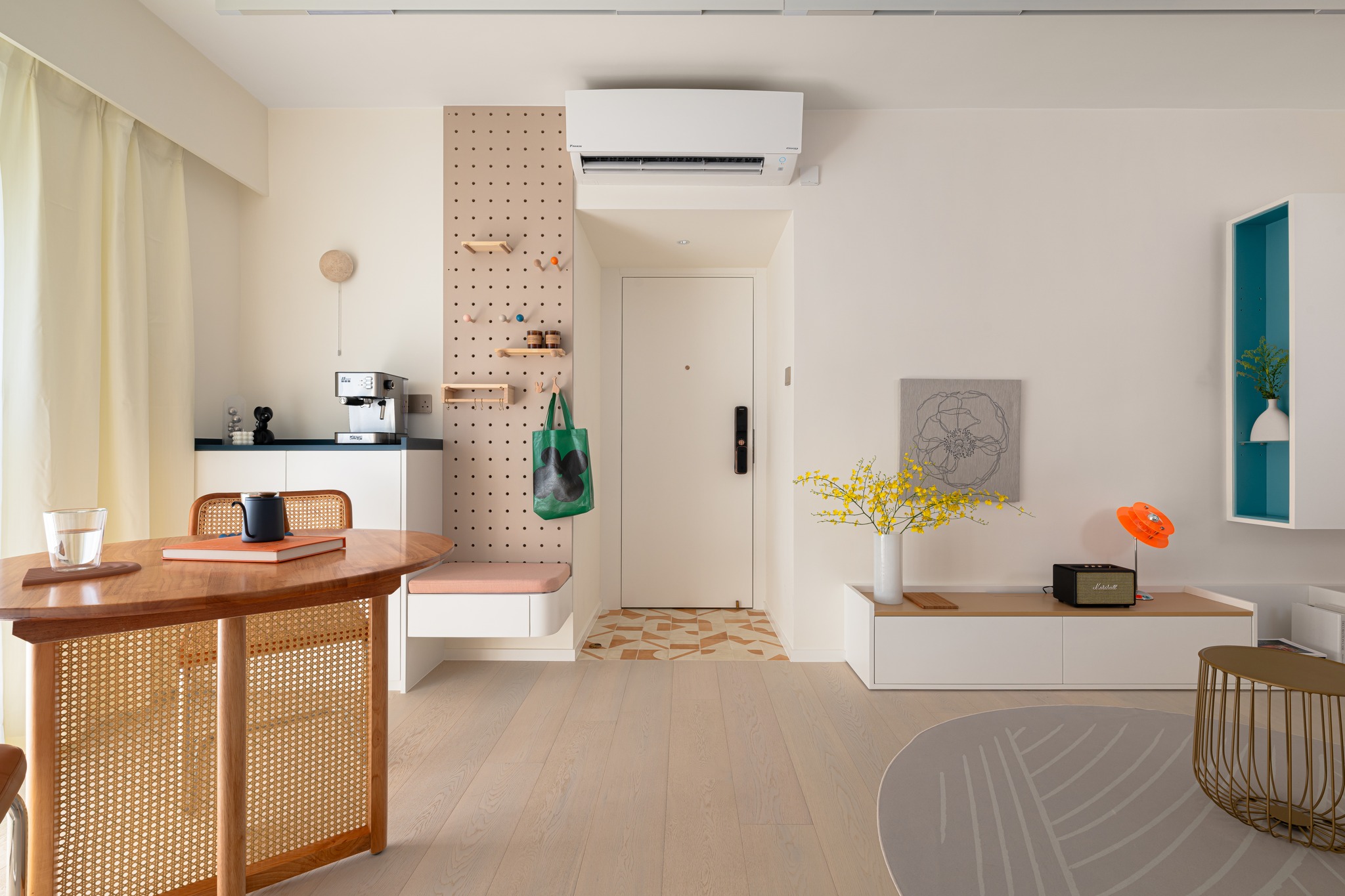 The old unit located in the South District, which is 45 years old, has been designed and renovated. The living room uses the color separation of the platform materials as a key.Also the storage too. The entire unit uses a simple European and American style to create a fresh beauty, and a bright and lively matching of colors to enhance the vitality of the entire living room.