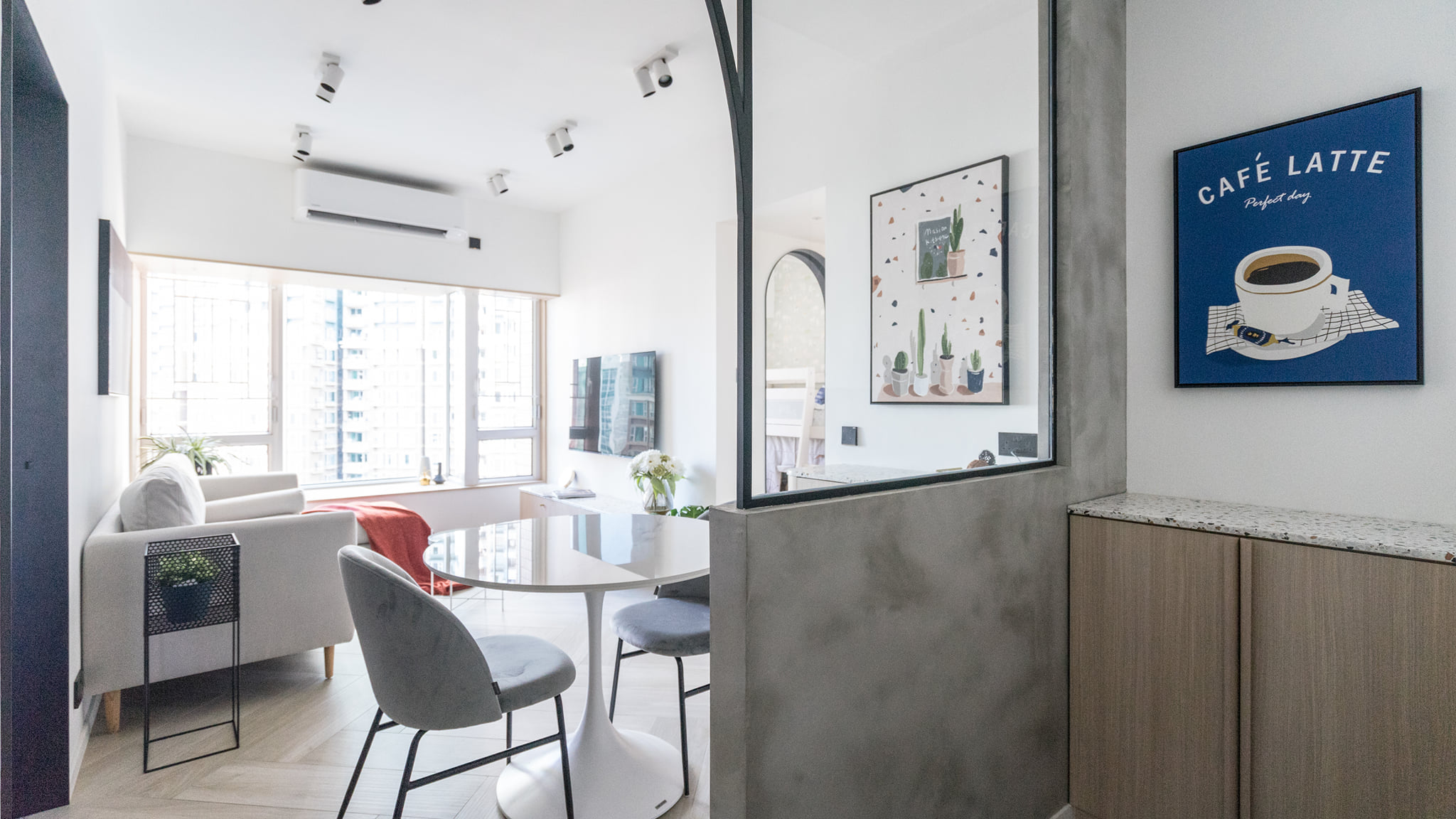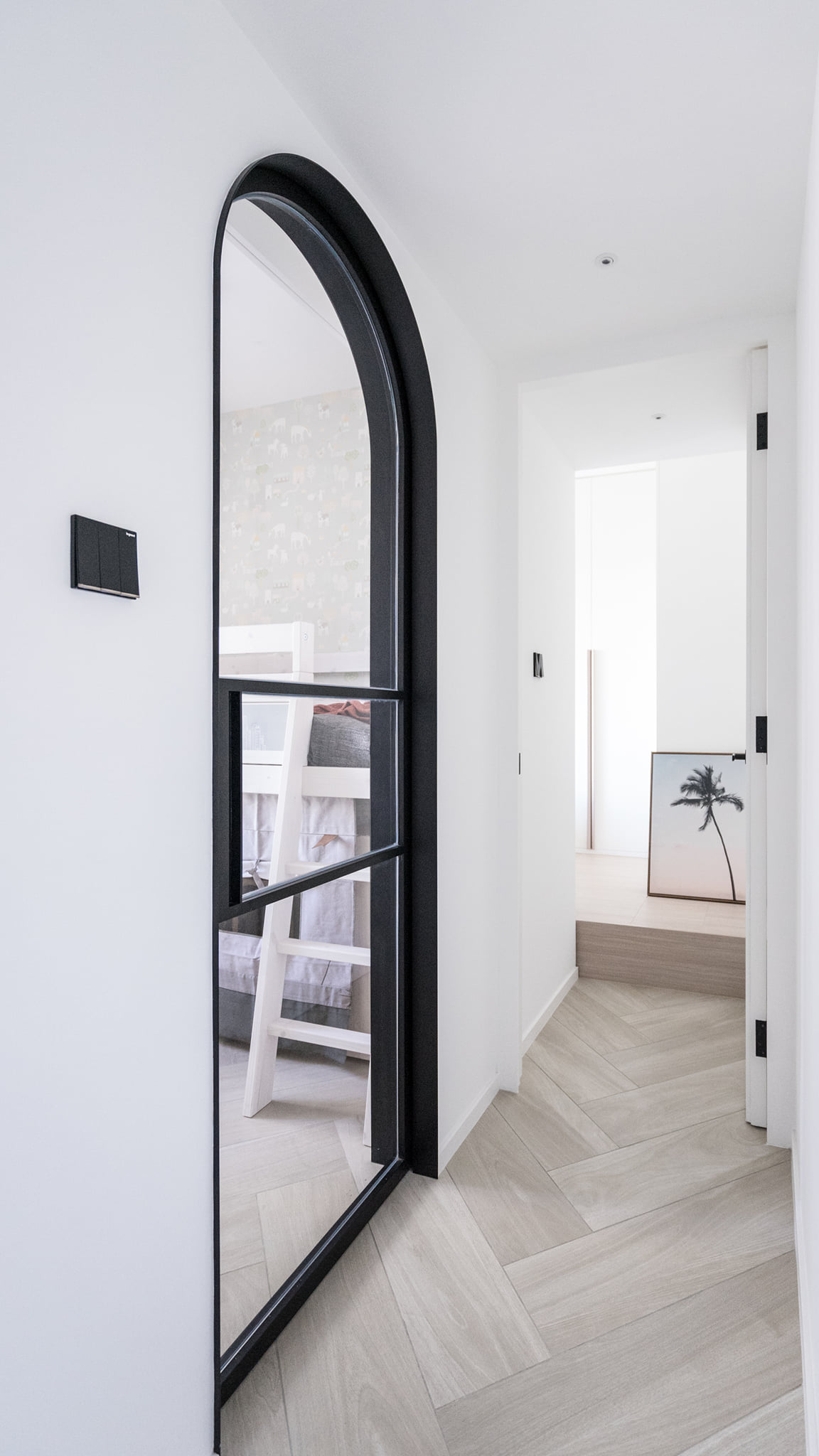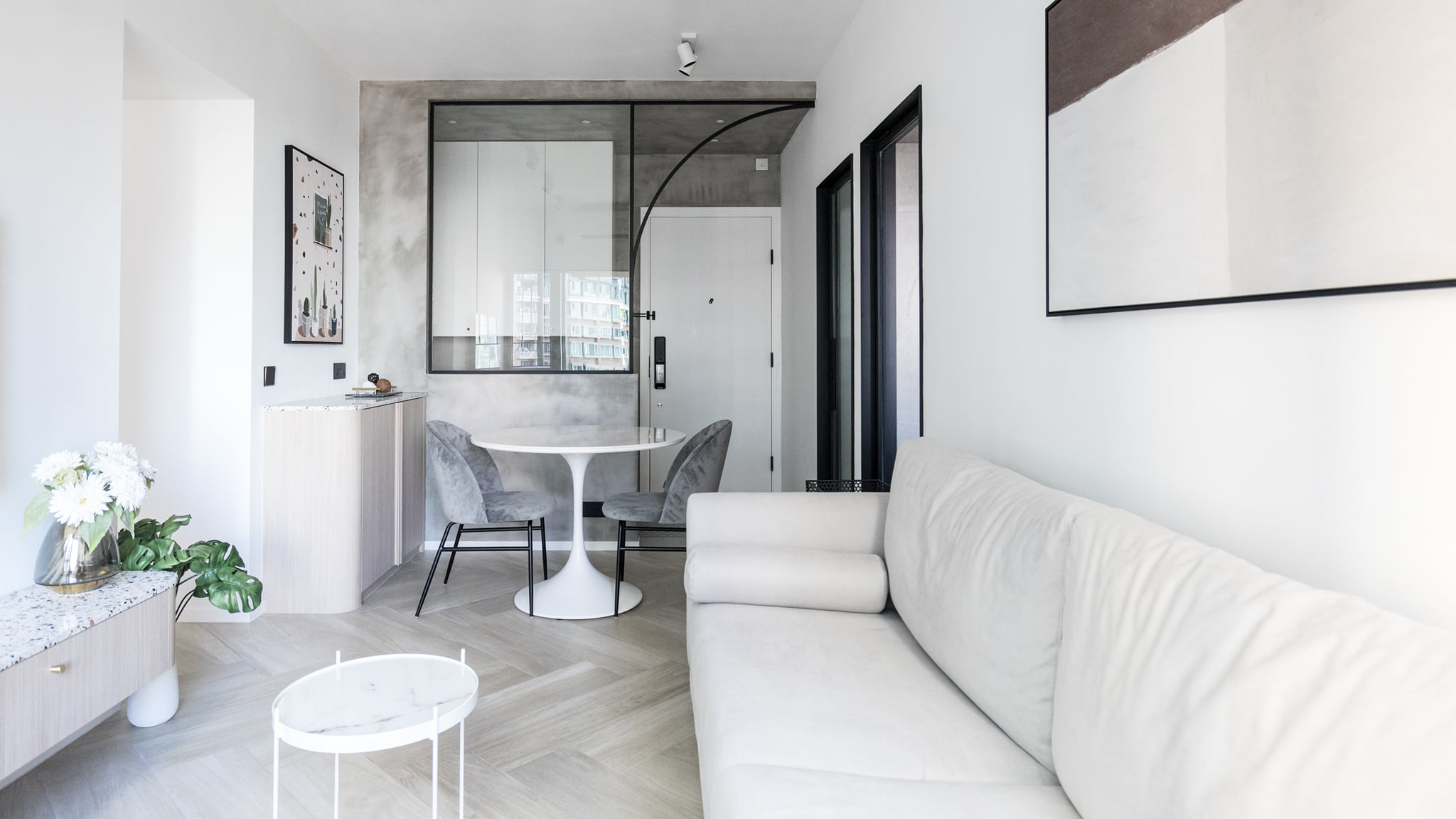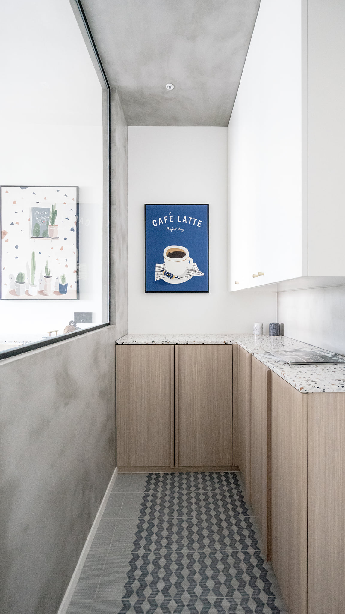 A young couple particularly favored the balanced color palette of Scandinavian design, with clean lines and pure elements serving as the starting point for a minimalist aesthetic. The design also needed to align with their lifestyle. Throughout the space, the designer skillfully interweaved stone and iron materials, incorporating various textures to revitalize this urban cottage. The entryway, featuring patterned tiles, became a kind of time portal, while curved elements broke the monotony of vertical visuals, achieving balance and adding a touch of beauty. In terms of color scheme, carefully arranged light wood-grain floor tiles paired with terrazzo accents on the cabinets subtly created an irregular visual experience, enhancing the overall warmth of the home.