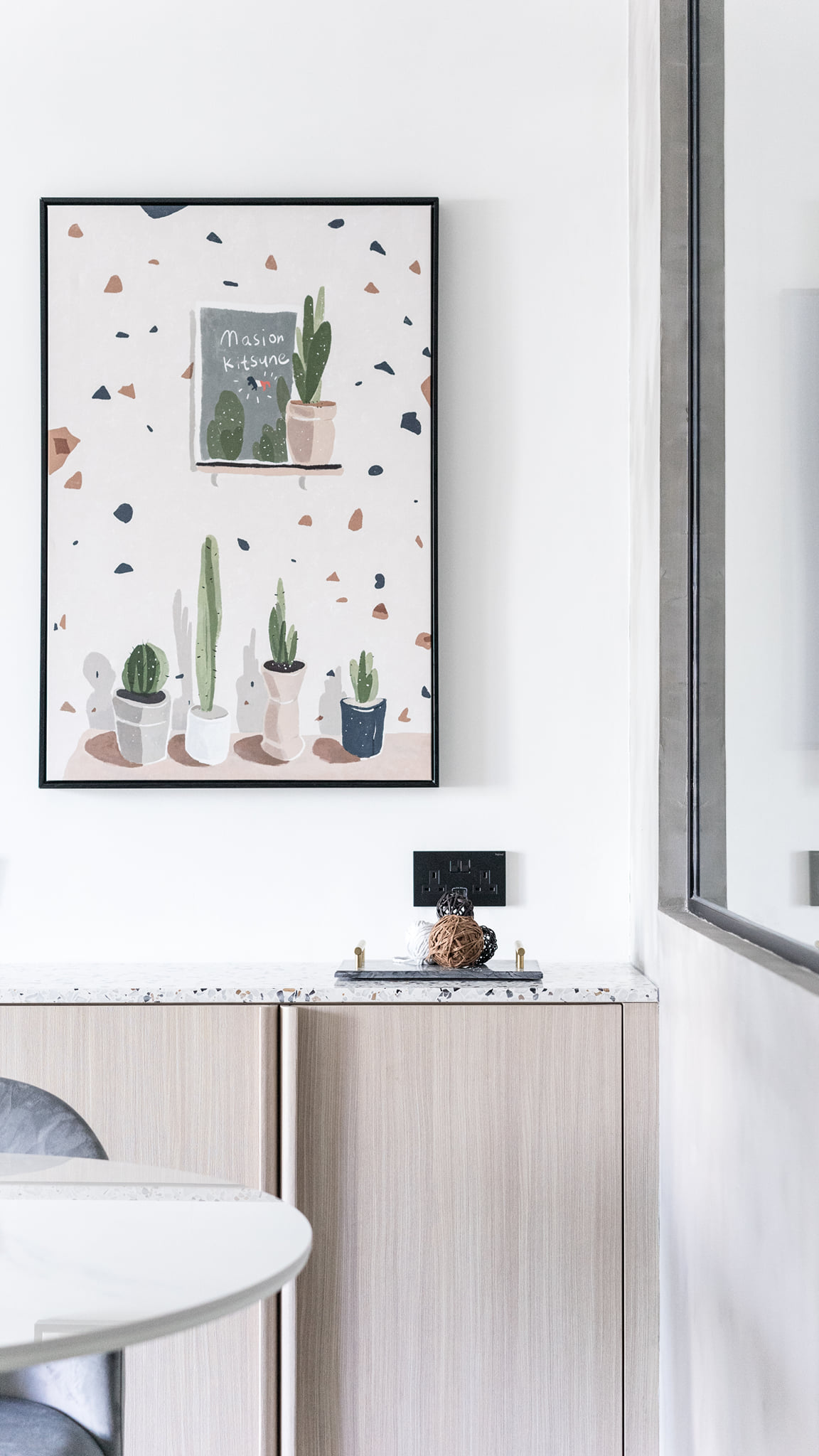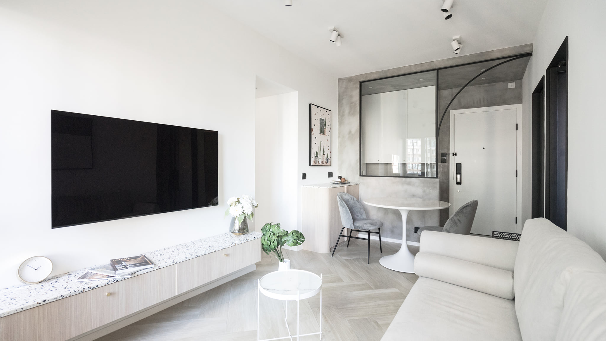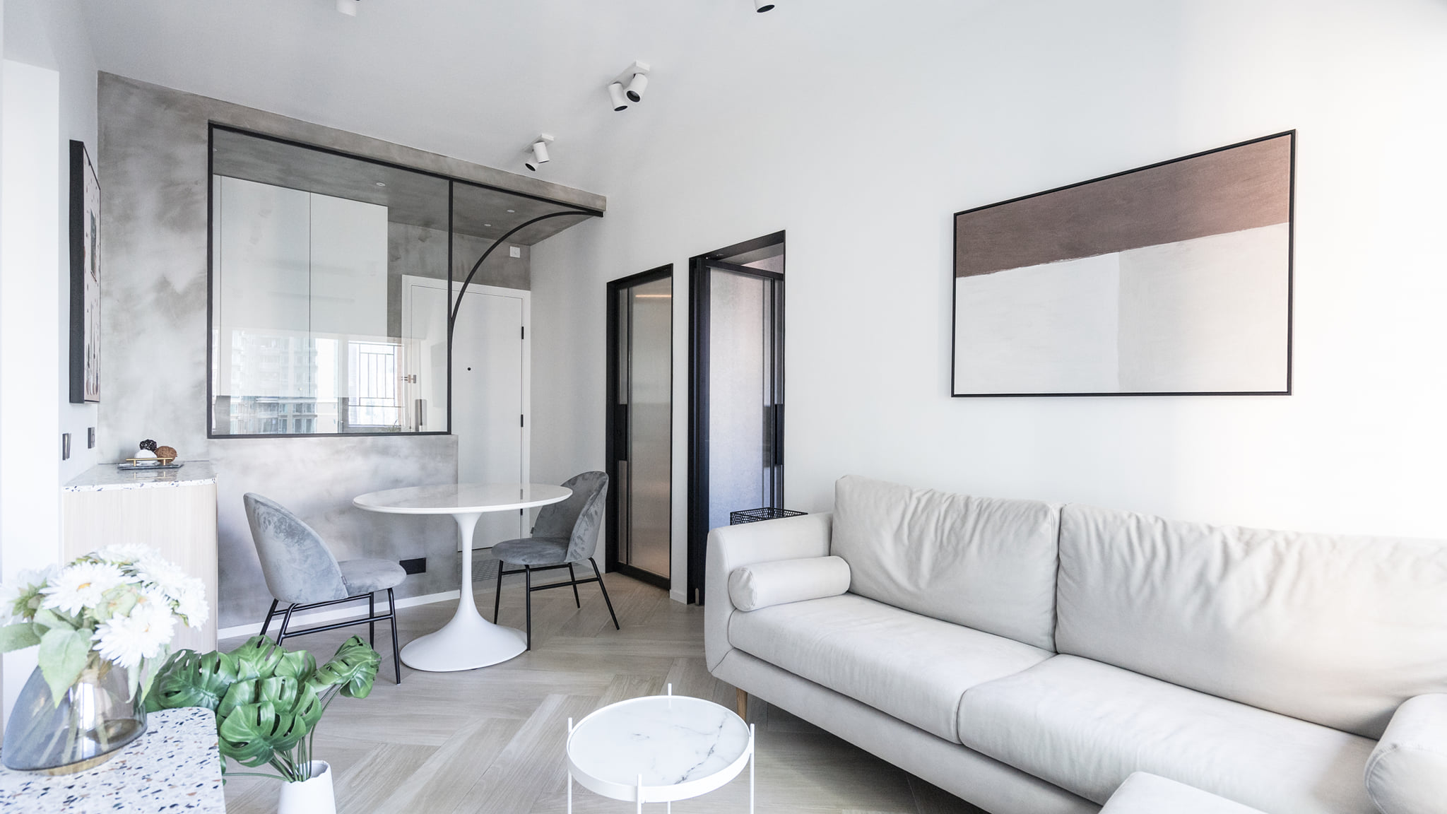 A young couple particularly favored the balanced color palette of Scandinavian design, with clean lines and pure elements serving as the starting point for a minimalist aesthetic. The design also needed to align with their lifestyle. Throughout the space, the designer skillfully interweaved stone and iron materials, incorporating various textures to revitalize this urban cottage. The entryway, featuring patterned tiles, became a kind of time portal, while curved elements broke the monotony of vertical visuals, achieving balance and adding a touch of beauty. In terms of color scheme, carefully arranged light wood-grain floor tiles paired with terrazzo accents on the cabinets subtly created an irregular visual experience, enhancing the overall warmth of the home.