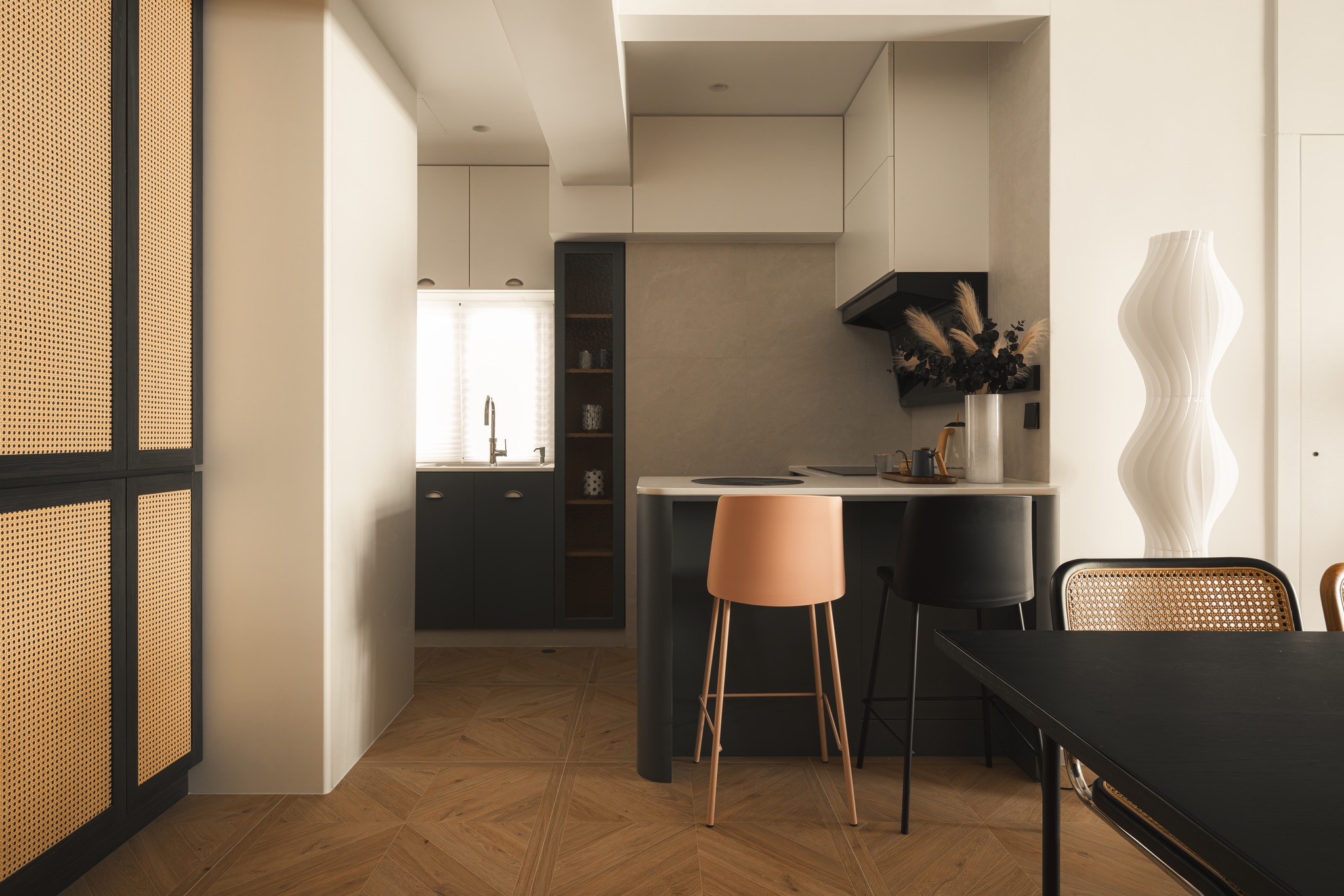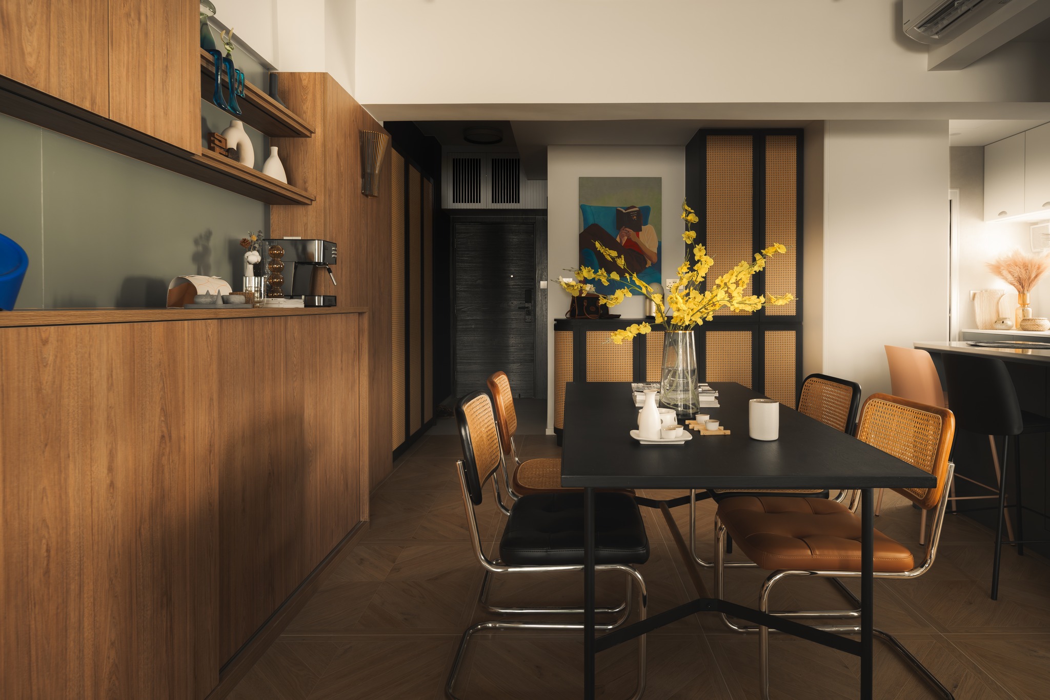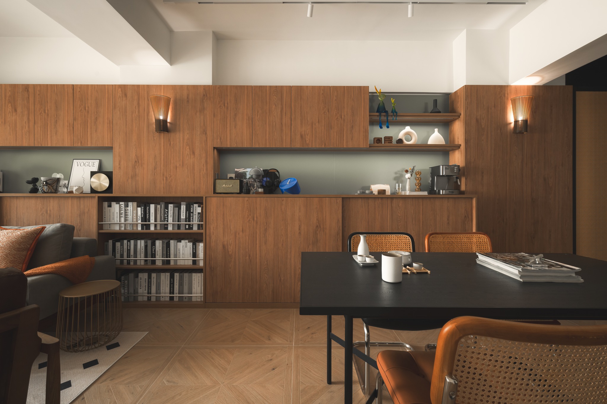 This project is based on the medieval style, using olive green and walnut colors on a large scale to lay a refined retro tone for the home. The interspersed elements of rattan, arc, tiles floors polish the details of the space again, making each the space is full of exquisite retro and fashionable styles. Let’s walk into a home with medieval style decoration and design!