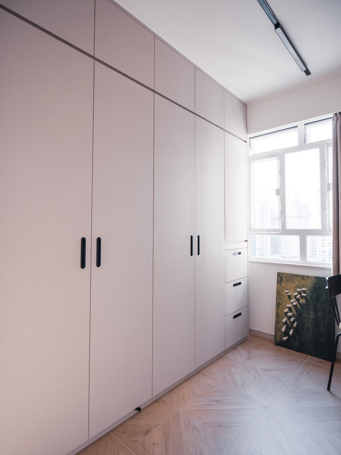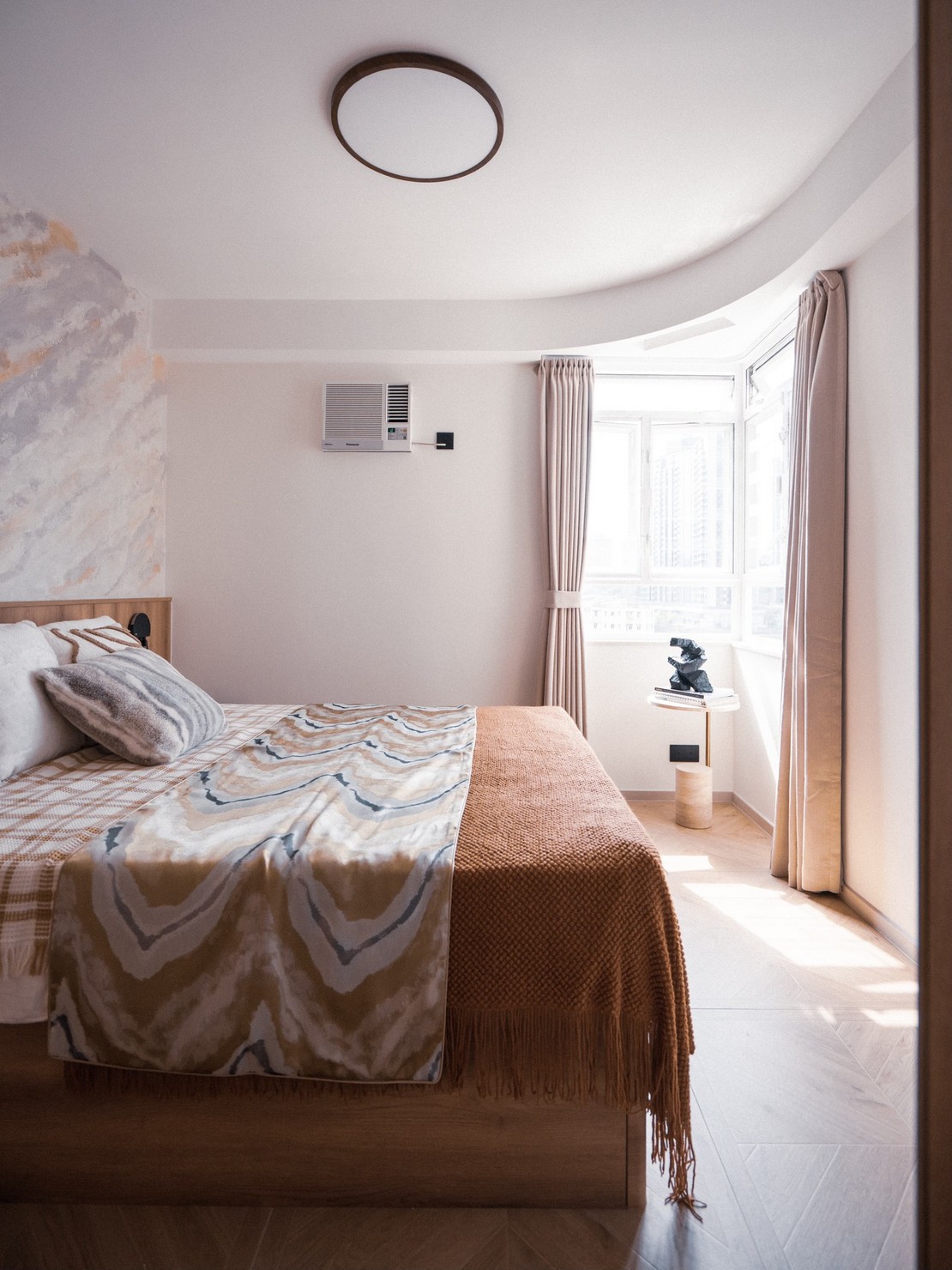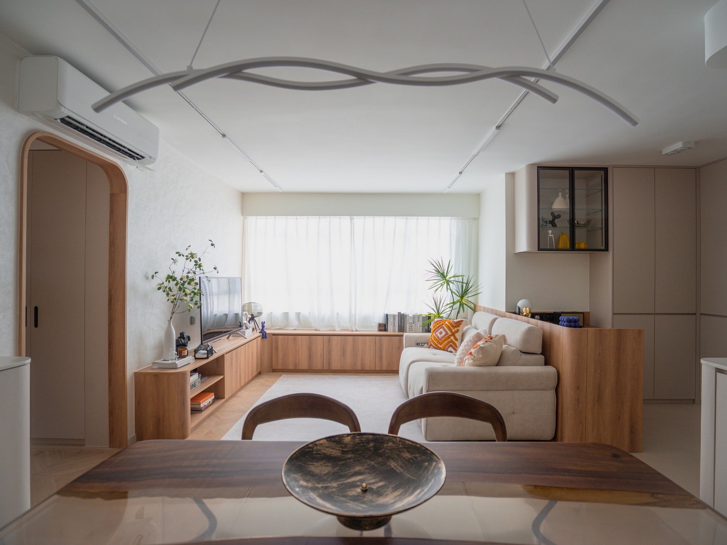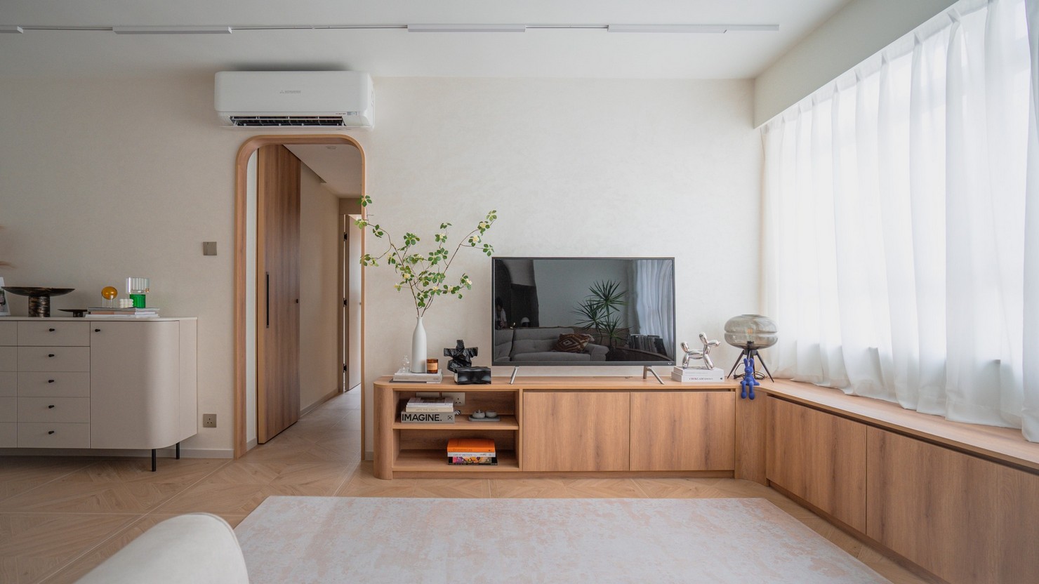 This time, a wood-based design was created for the two elderly homeowners, bringing the breath of nature into the home. Every inch of the space exudes a warm wood fragrance, as if you are in the embrace of the forest. Soft tones interweave with natural light, making the entire space appear bright and open. The wall is decorated with rock patterns and goose down, which forms a harmonious contrast with the wood color and creates a comfortable and relaxing atmosphere. The open kitchen is equipped with custom hardware cabinets and incorporates barrier-free design to create a quiet and pleasant lifestyle.
