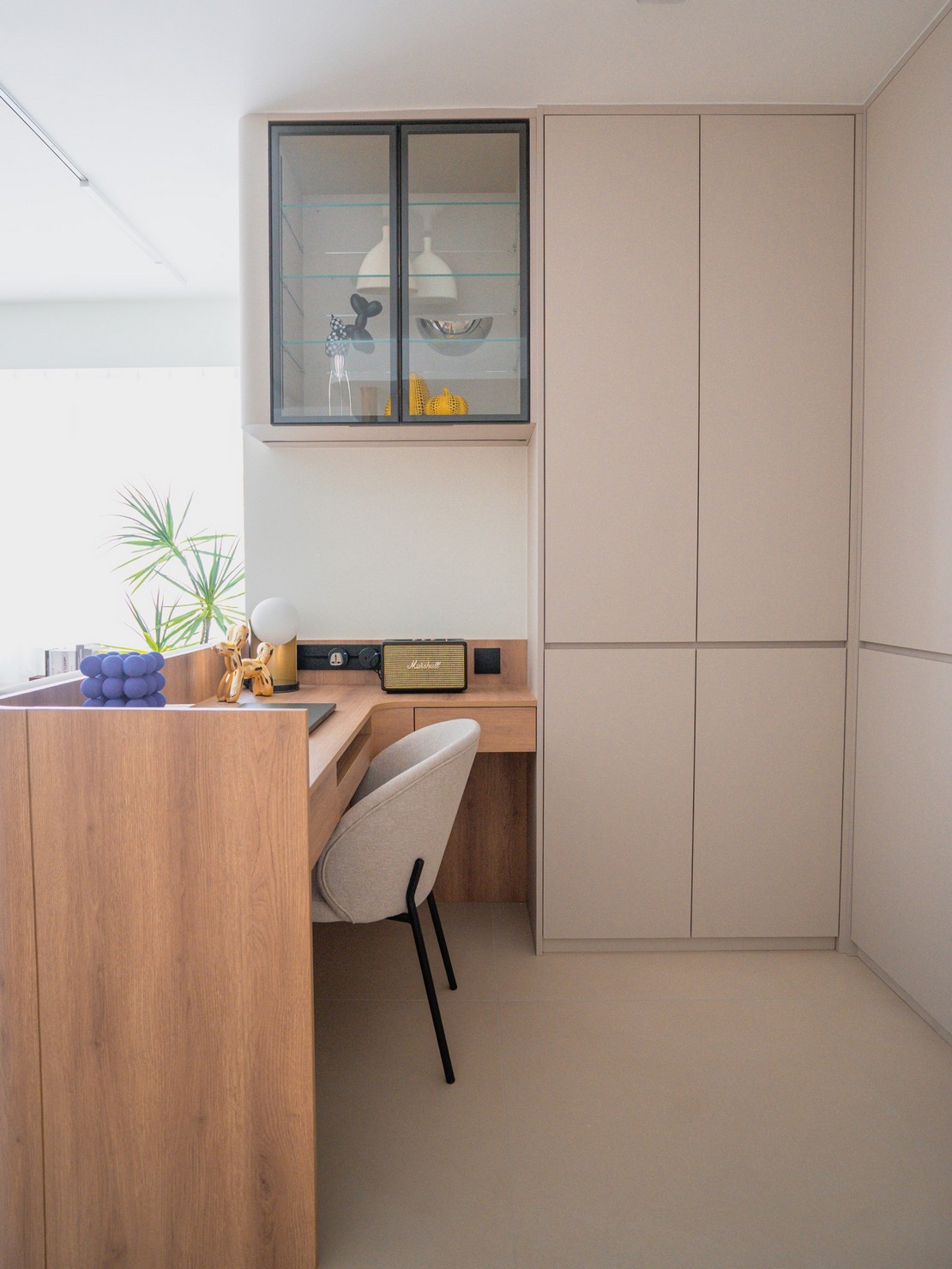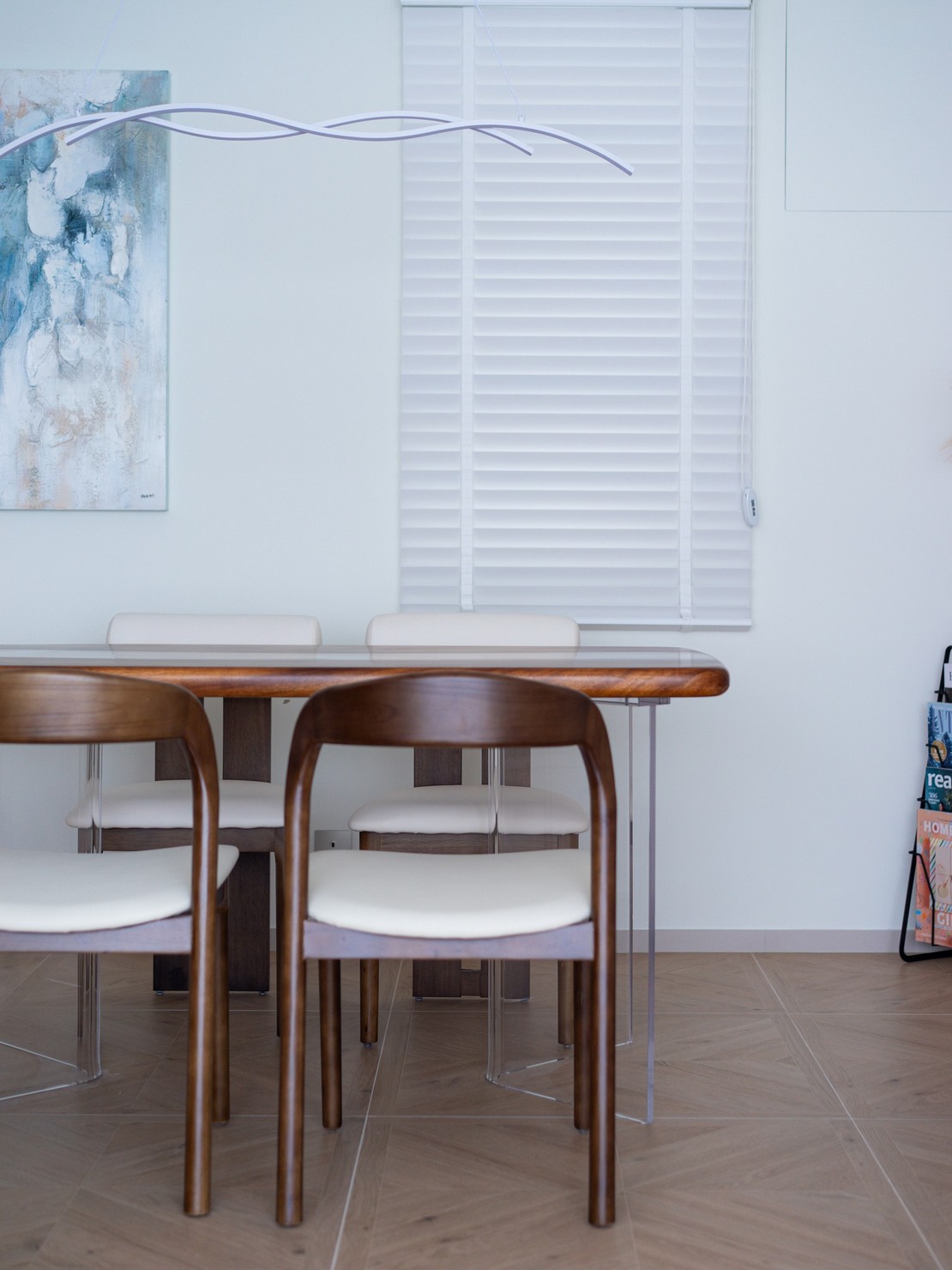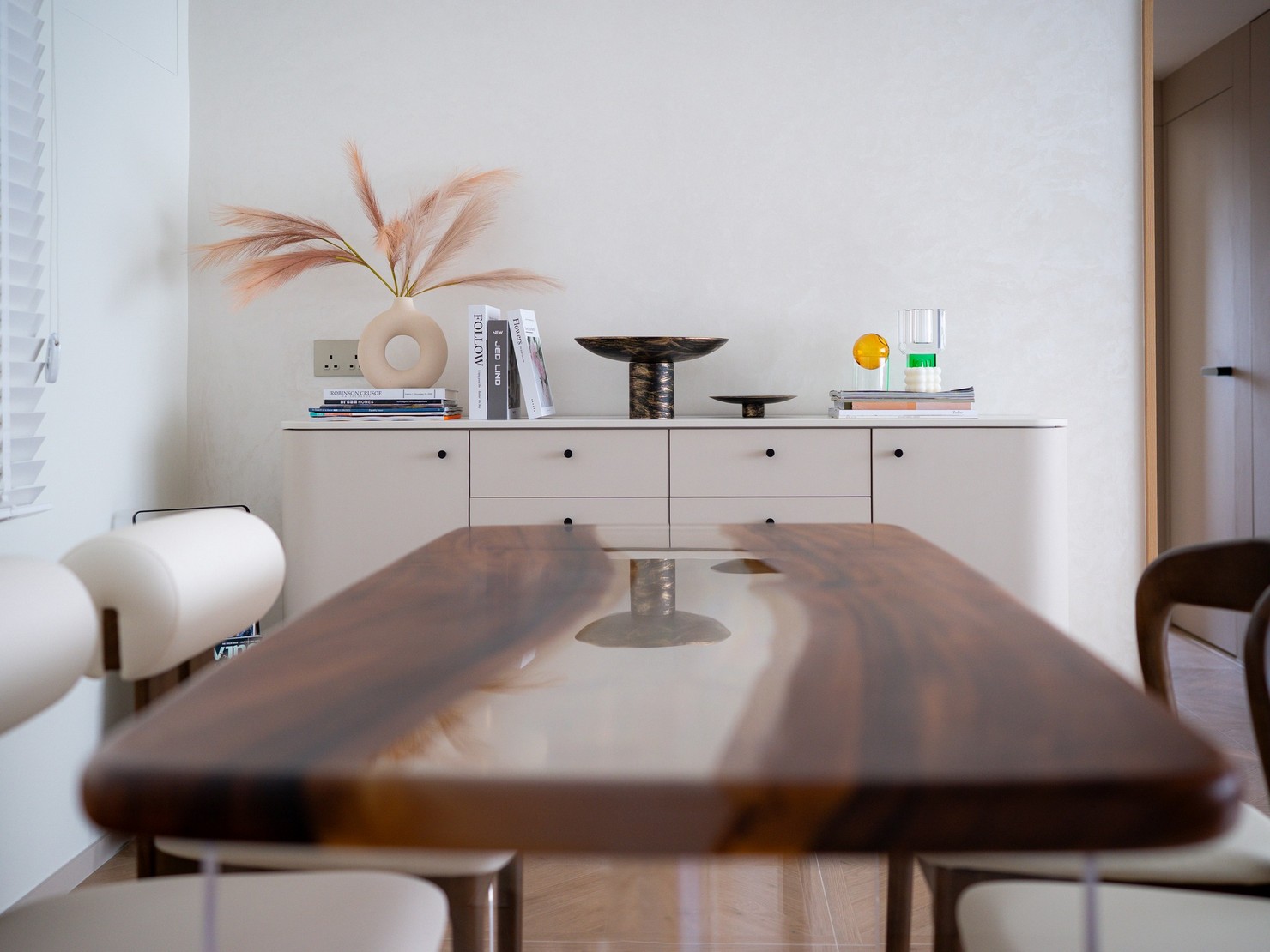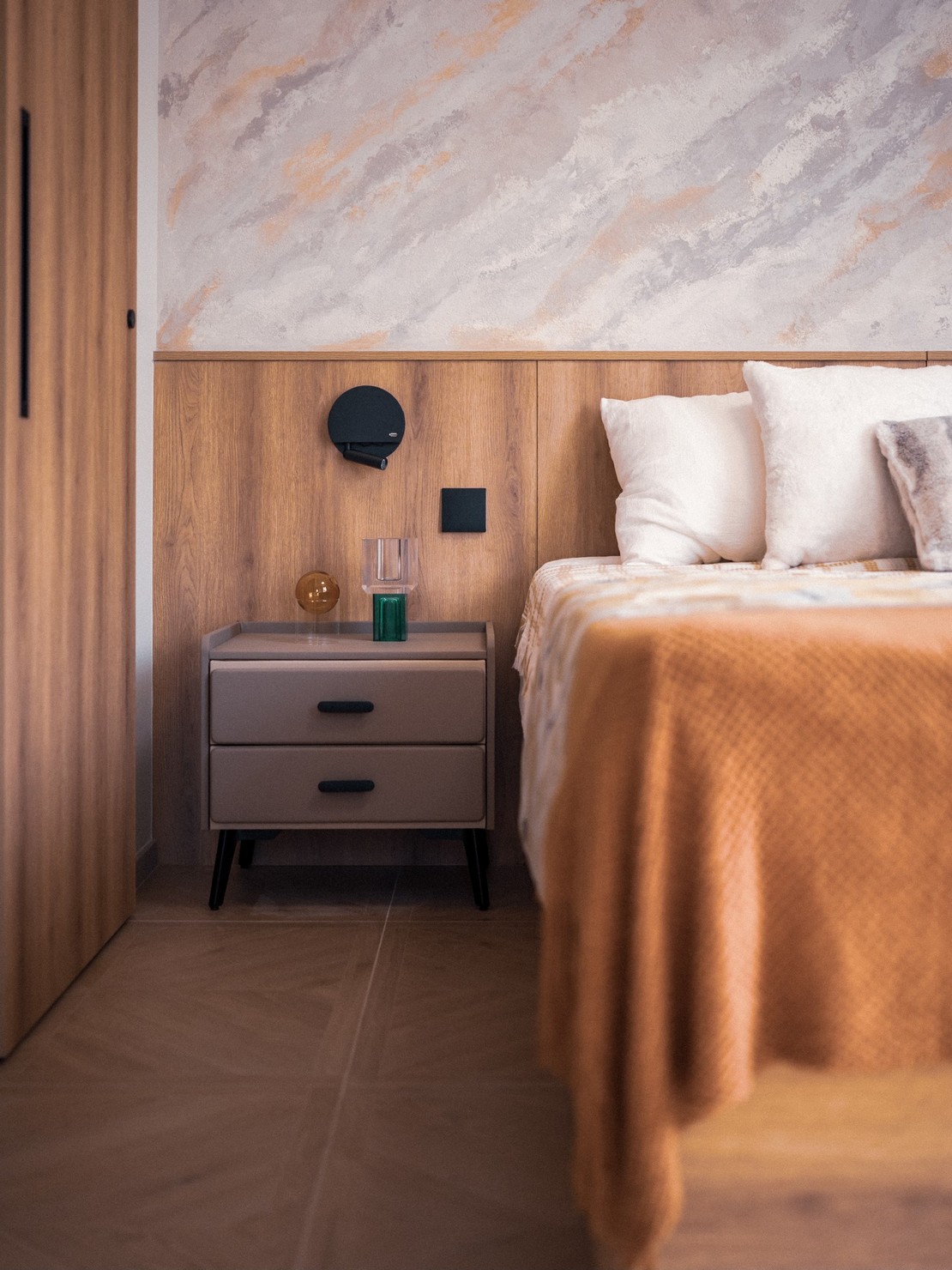 This time, a wood-based design was created for the two elderly homeowners, bringing the breath of nature into the home. Every inch of the space exudes a warm wood fragrance, as if you are in the embrace of the forest. Soft tones interweave with natural light, making the entire space appear bright and open. The wall is decorated with rock patterns and goose down, which forms a harmonious contrast with the wood color and creates a comfortable and relaxing atmosphere. The open kitchen is equipped with custom hardware cabinets and incorporates barrier-free design to create a quiet and pleasant lifestyle.