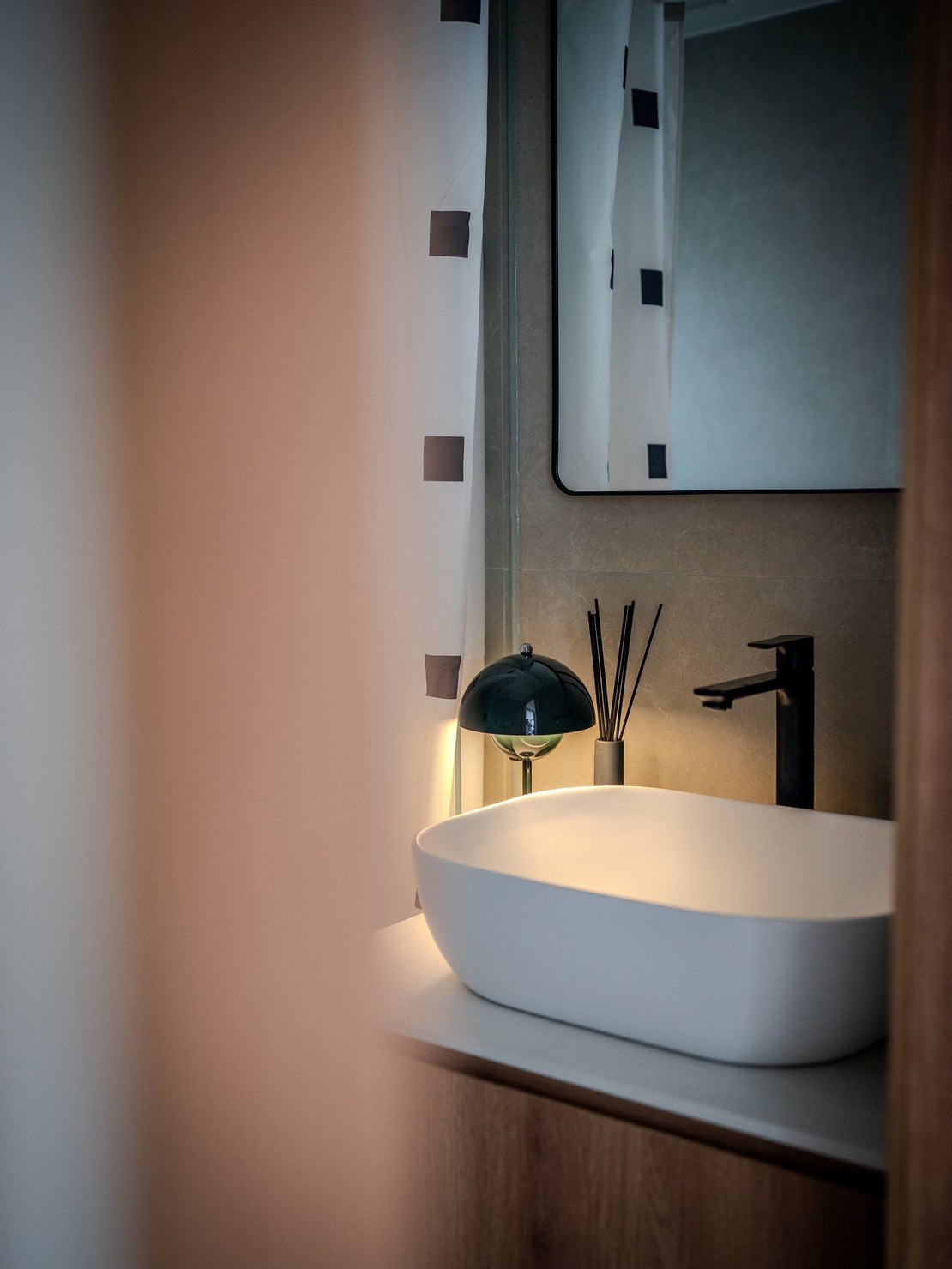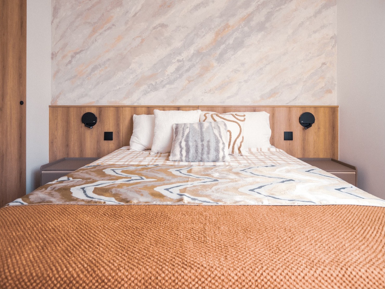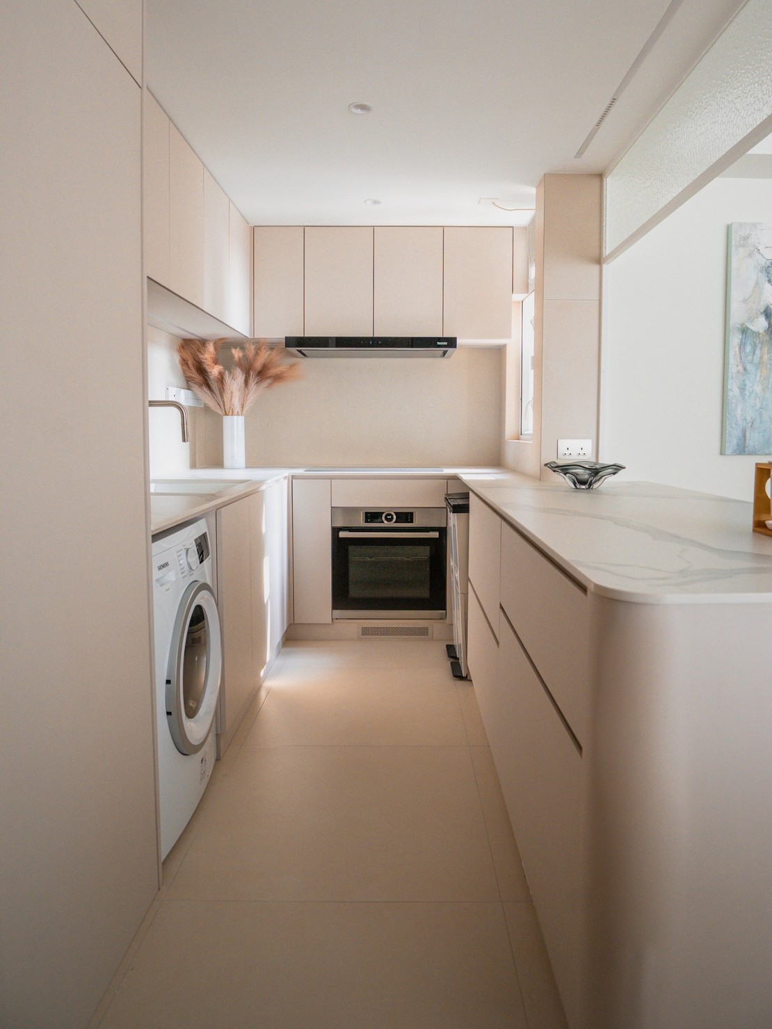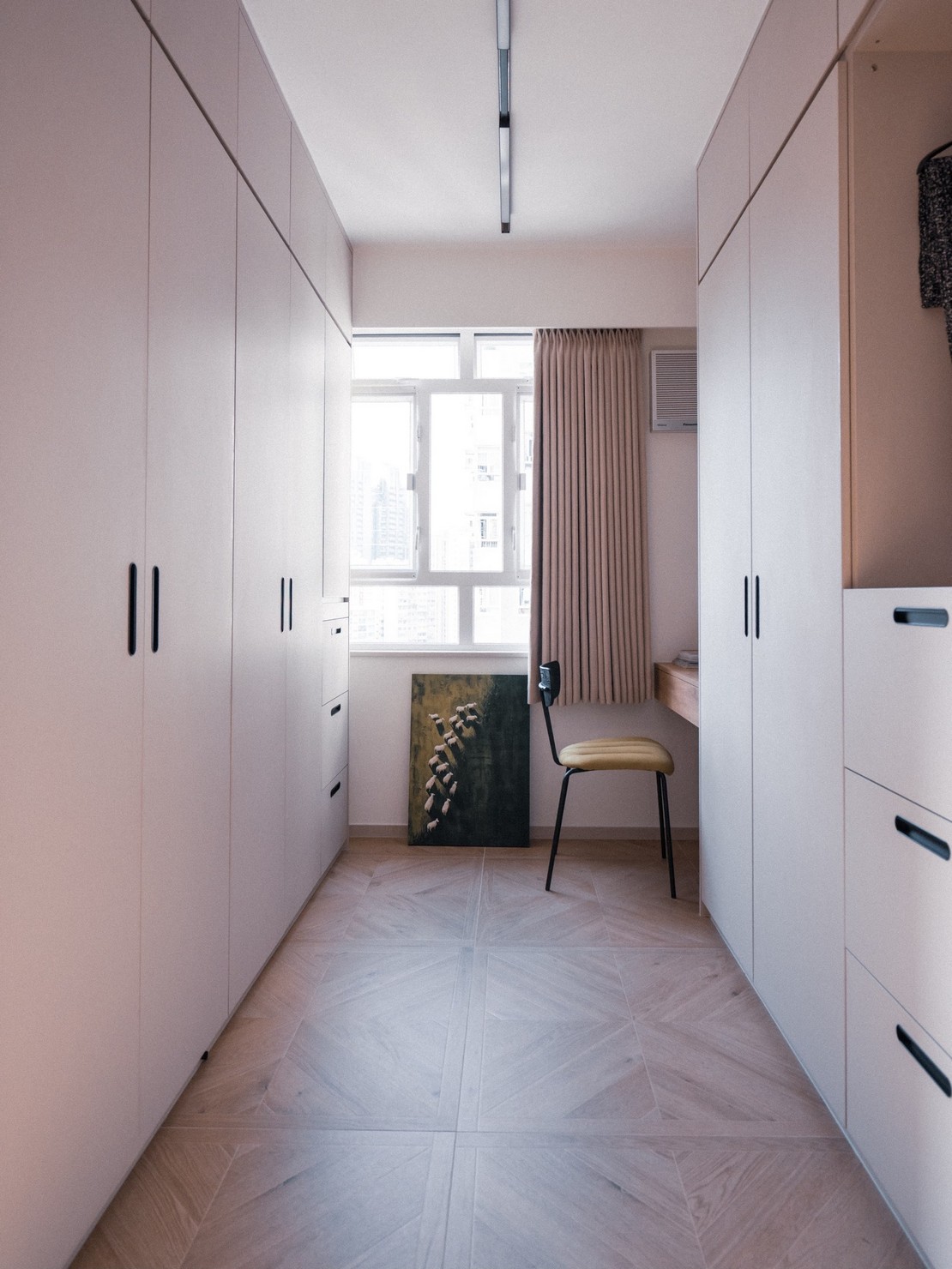 This time, a wood-based design was created for the two elderly homeowners, bringing the breath of nature into the home. Every inch of the space exudes a warm wood fragrance, as if you are in the embrace of the forest. Soft tones interweave with natural light, making the entire space appear bright and open. The wall is decorated with rock patterns and goose down, which forms a harmonious contrast with the wood color and creates a comfortable and relaxing atmosphere. The open kitchen is equipped with custom hardware cabinets and incorporates barrier-free design to create a quiet and pleasant lifestyle.