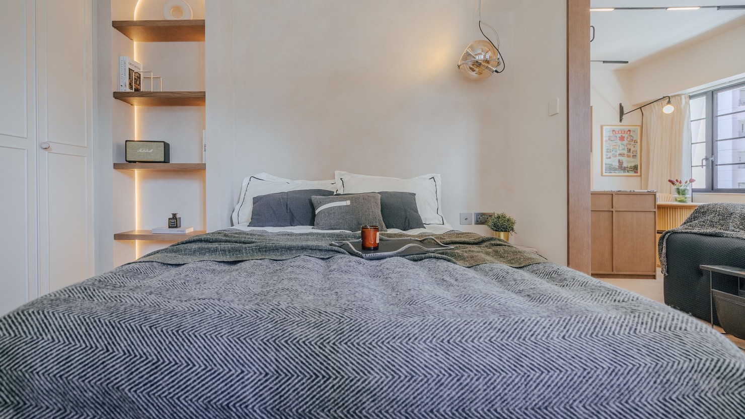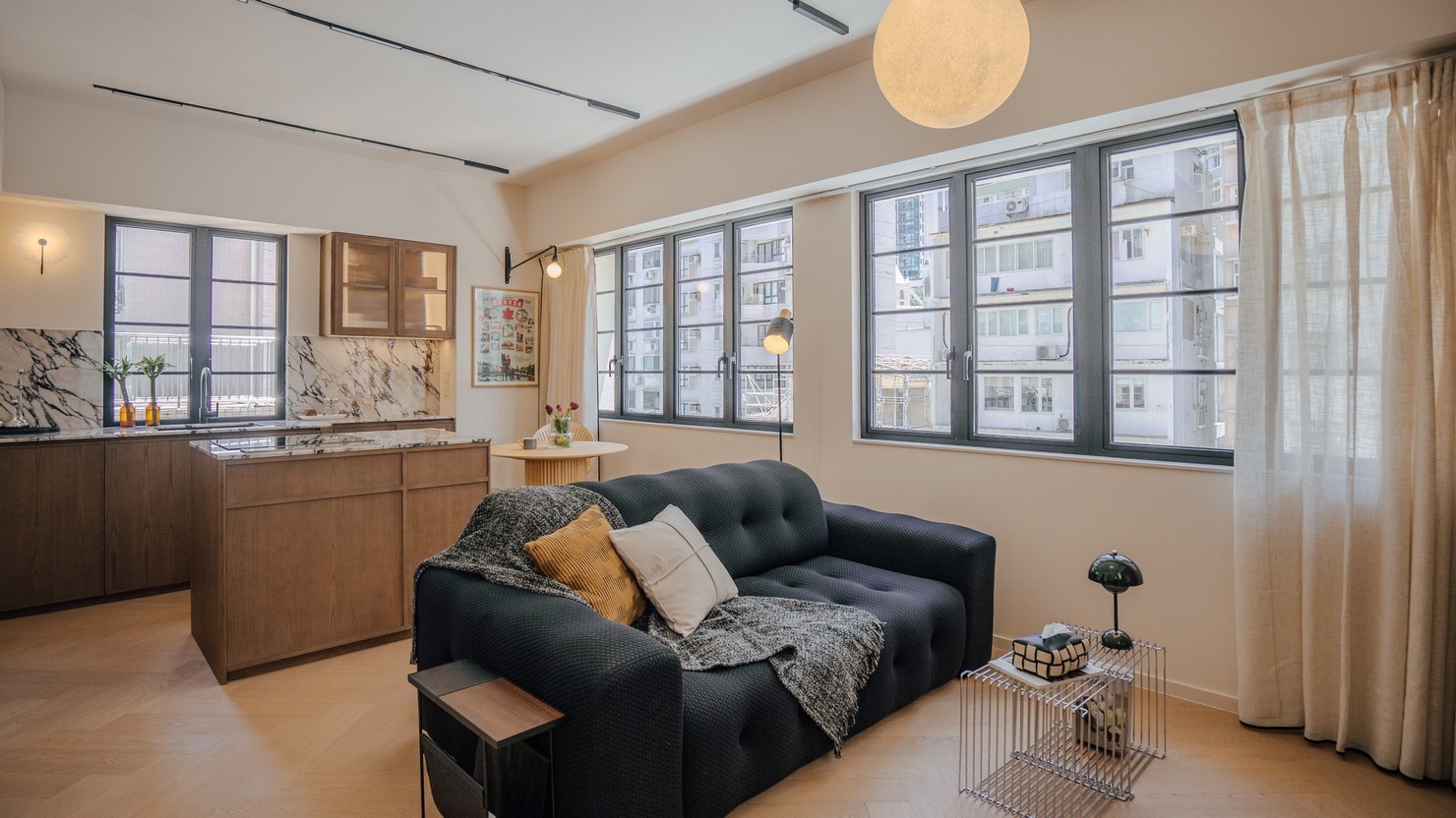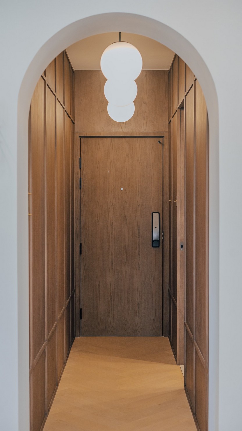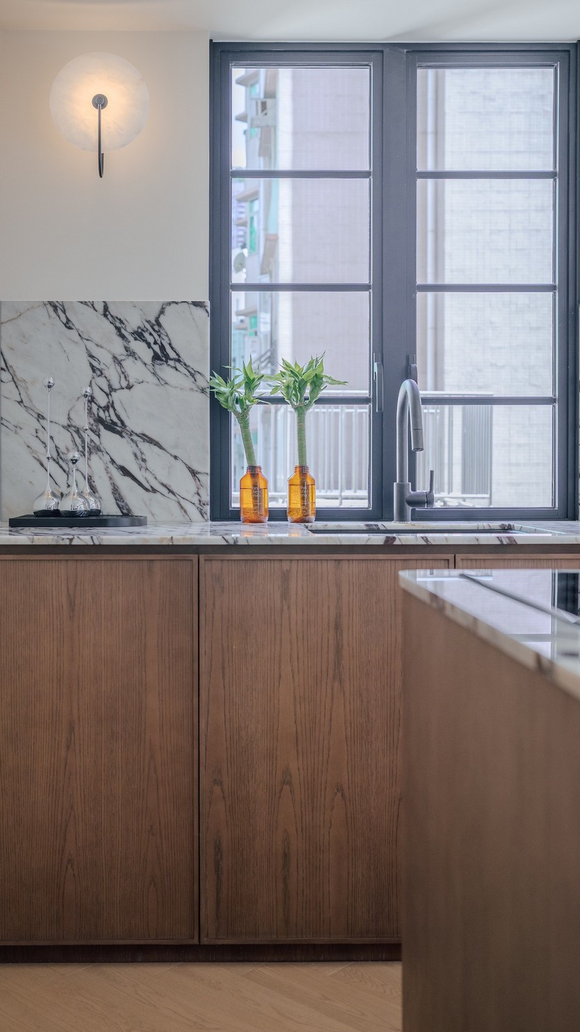 The Mid-Levels project was successfully completed and was tailor-made for an expatriate couple living in Hong Kong. The designer was ingenious and seamlessly integrated the homeowners’ familiarity and taste of overseas life into this Hong Kong residence. Entering the entrance hall, the warm walnut tone sets an elegant tone. The rhythm of the herringbone laminate flooring, paired with a carefully selected feature chandelier, the interweaving of light and shadow gives the corridor a rich visual layering. The open kitchen continues the warmth of walnut, complementing the Italian marble wall, and together constructs a refined and elegant cooking and dining space. The highlight of the entire space is concentrated in the living room. The designer cleverly uses a set of customized feature screens as partitions, which not only effectively divides the functional areas, but its unique shape and material have become an eye-catching art installation in the space, creating a transparent and stylish atmosphere.