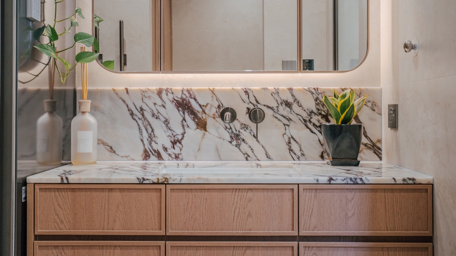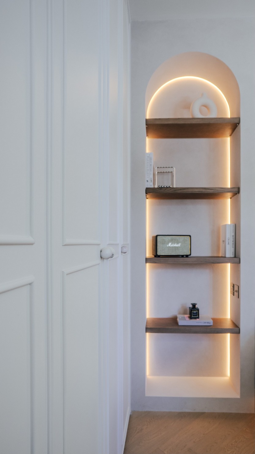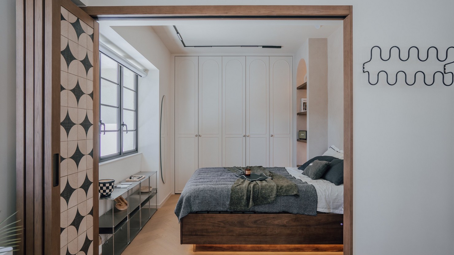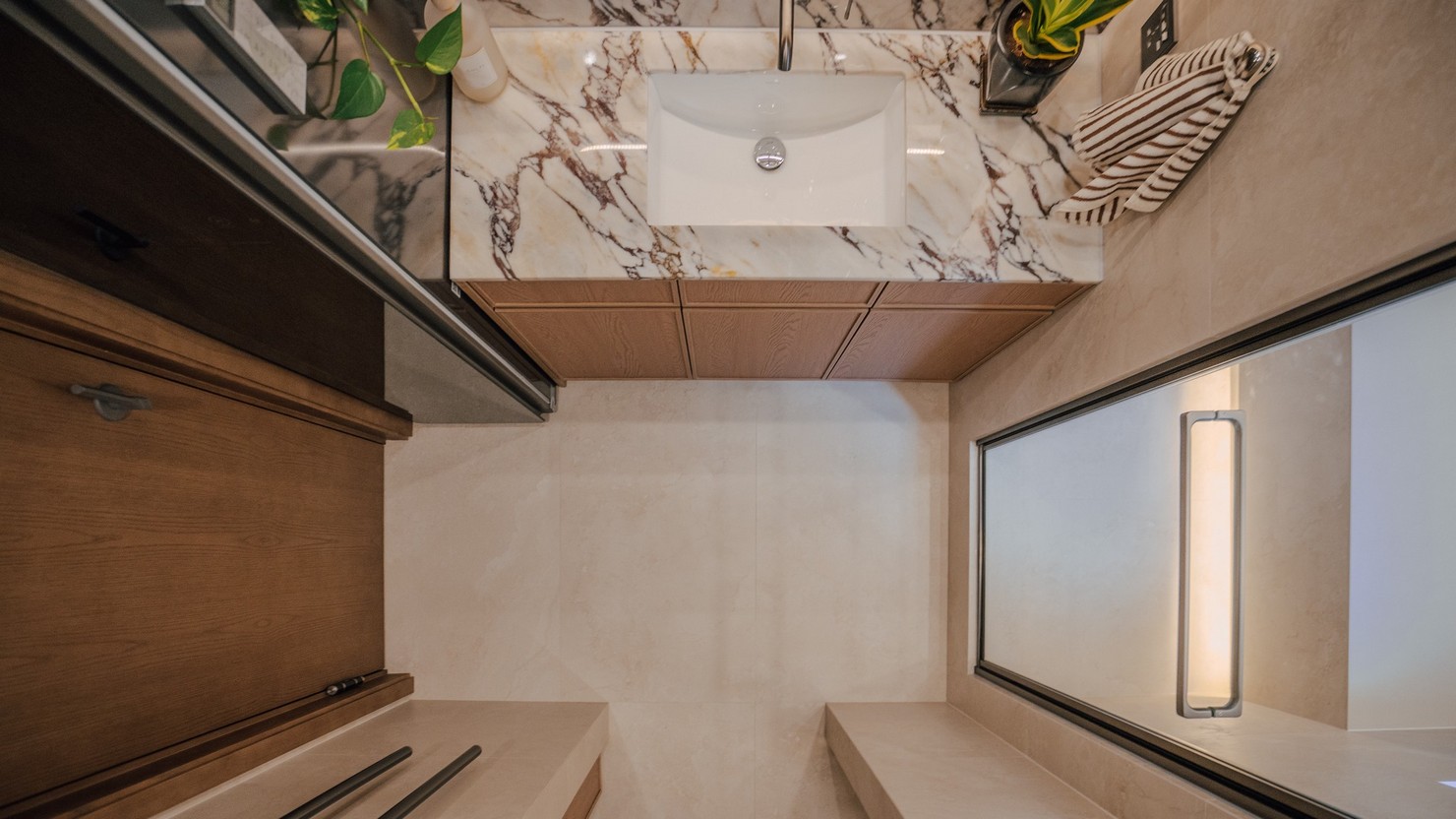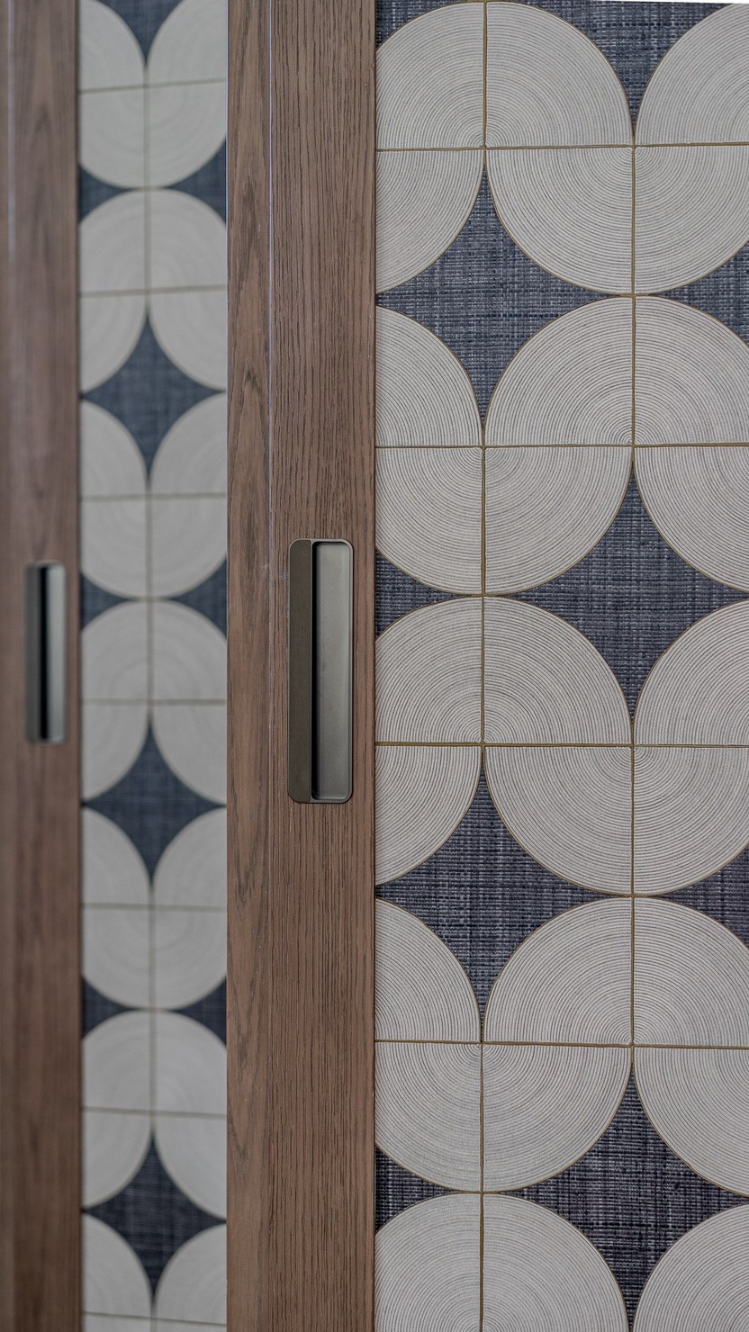 The Mid-Levels project was successfully completed and was tailor-made for an expatriate couple living in Hong Kong. The designer was ingenious and seamlessly integrated the homeowners’ familiarity and taste of overseas life into this Hong Kong residence. Entering the entrance hall, the warm walnut tone sets an elegant tone. The rhythm of the herringbone laminate flooring, paired with a carefully selected feature chandelier, the interweaving of light and shadow gives the corridor a rich visual layering. The open kitchen continues the warmth of walnut, complementing the Italian marble wall, and together constructs a refined and elegant cooking and dining space. The highlight of the entire space is concentrated in the living room. The designer cleverly uses a set of customized feature screens as partitions, which not only effectively divides the functional areas, but its unique shape and material have become an eye-catching art installation in the space, creating a transparent and stylish atmosphere.