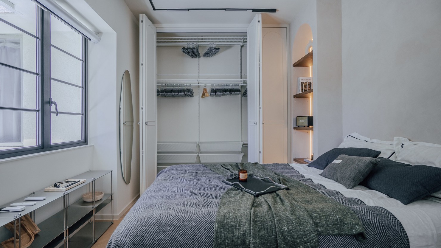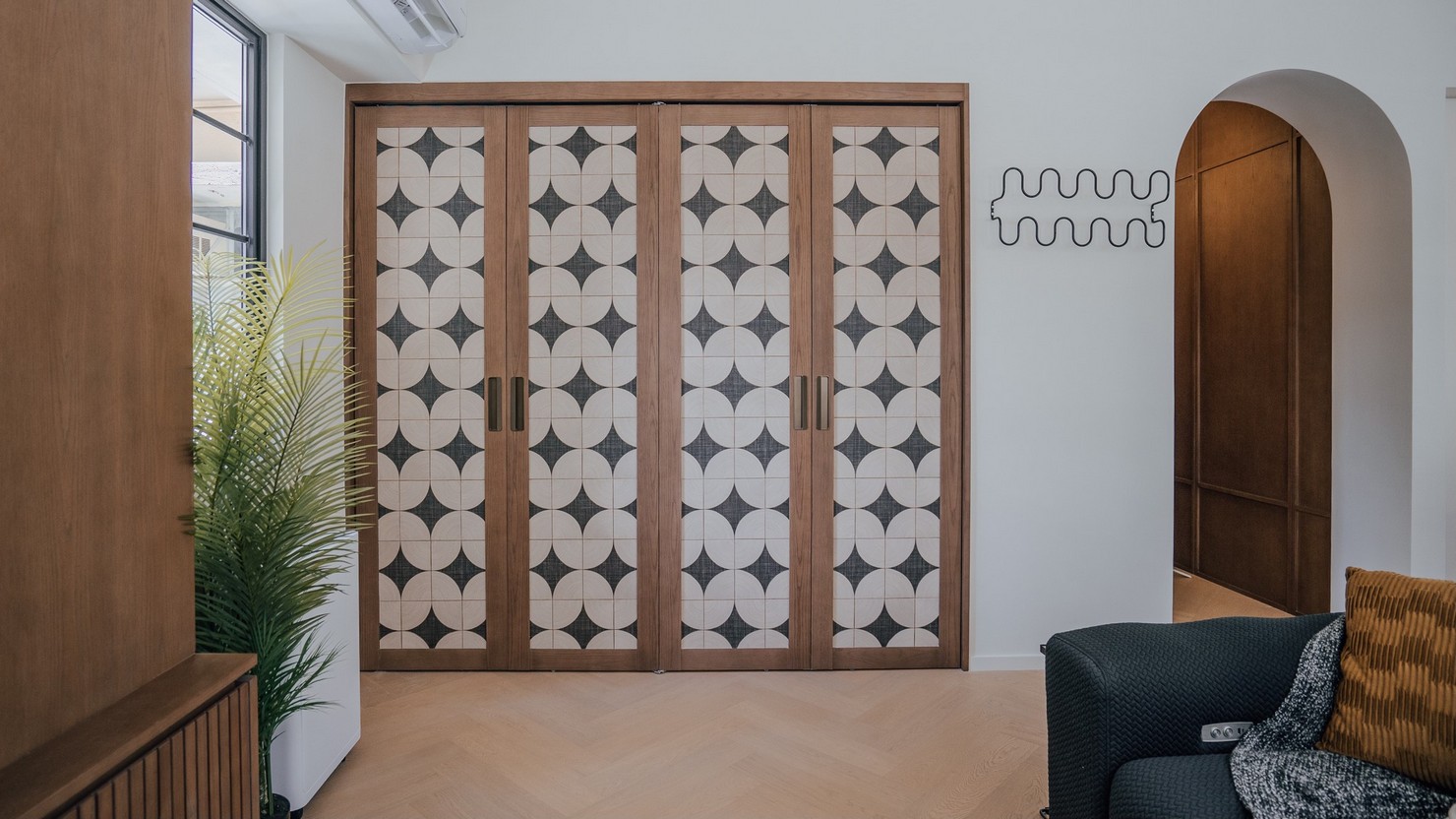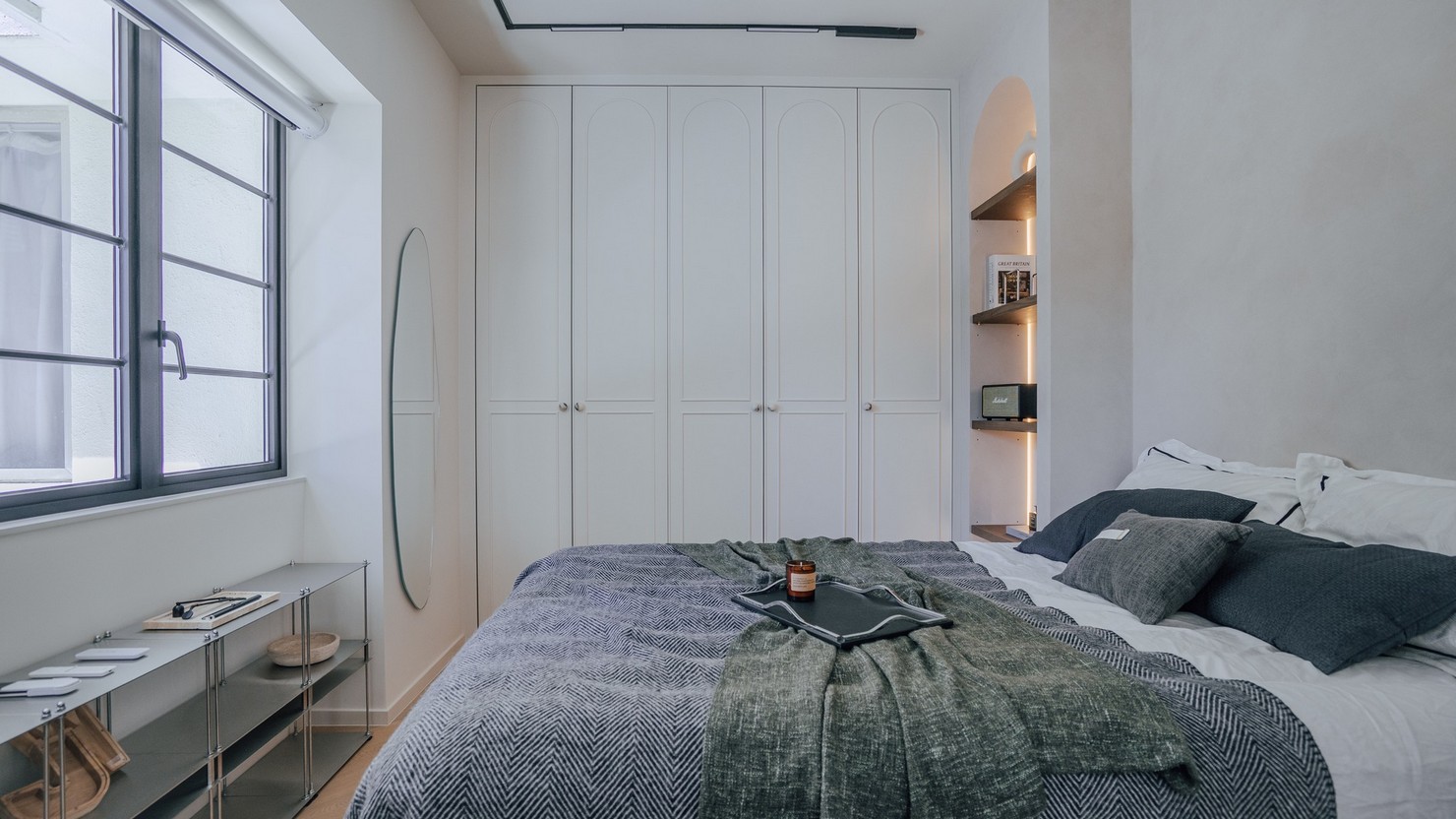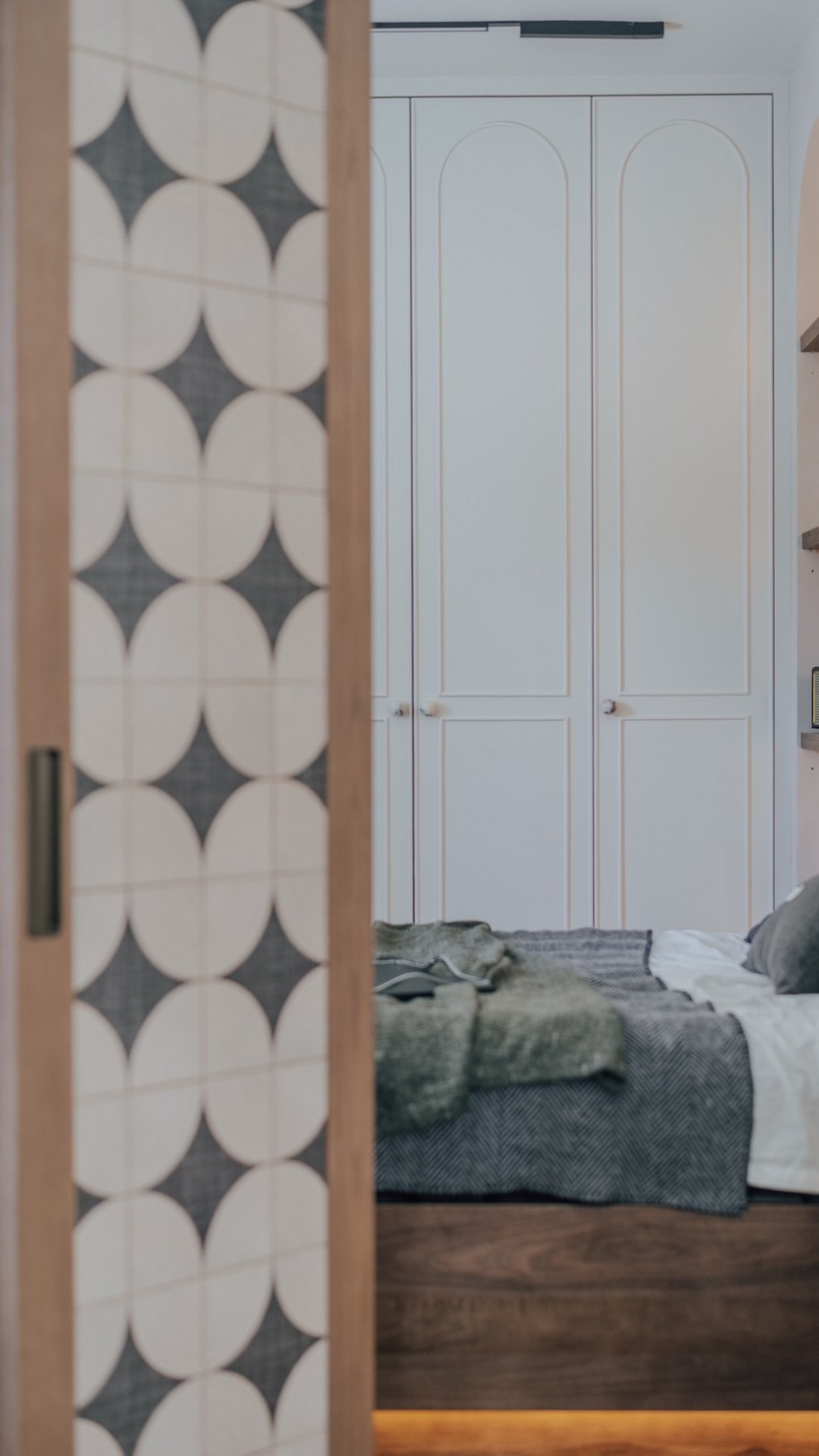 The Mid-Levels project was successfully completed and was tailor-made for an expatriate couple living in Hong Kong. The designer was ingenious and seamlessly integrated the homeowners’ familiarity and taste of overseas life into this Hong Kong residence. Entering the entrance hall, the warm walnut tone sets an elegant tone. The rhythm of the herringbone laminate flooring, paired with a carefully selected feature chandelier, the interweaving of light and shadow gives the corridor a rich visual layering. The open kitchen continues the warmth of walnut, complementing the Italian marble wall, and together constructs a refined and elegant cooking and dining space. The highlight of the entire space is concentrated in the living room. The designer cleverly uses a set of customized feature screens as partitions, which not only effectively divides the functional areas, but its unique shape and material have become an eye-catching art installation in the space, creating a transparent and stylish atmosphere.