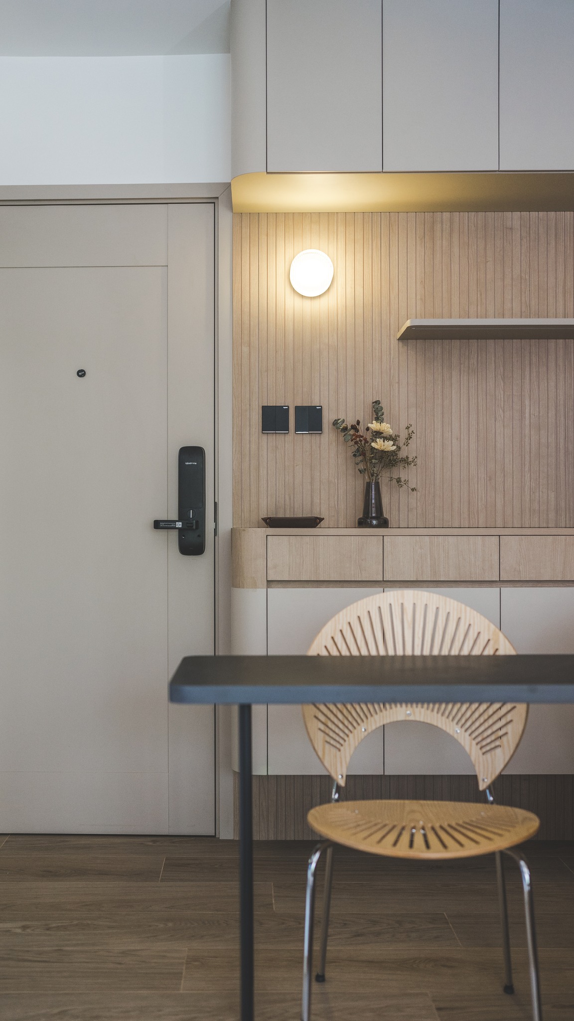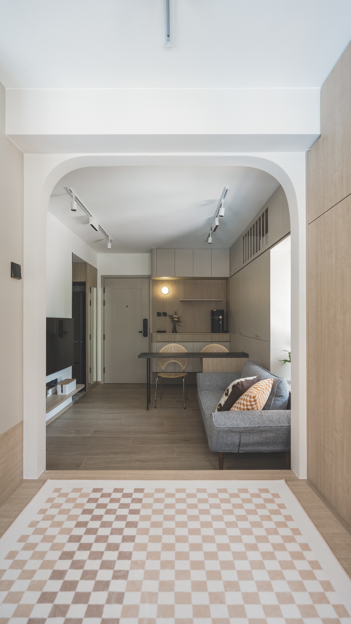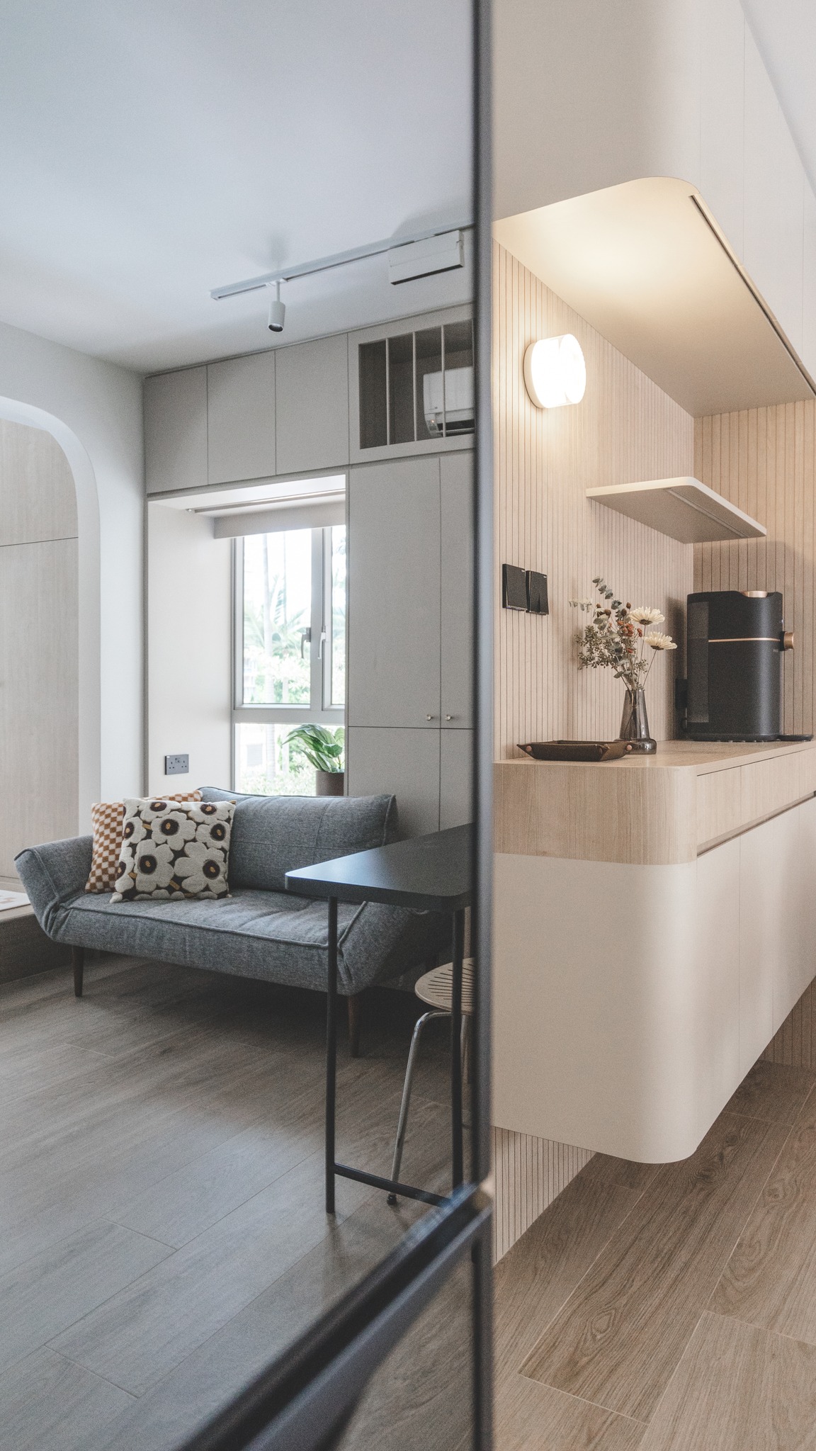 一個寬敞的居室,計算出弧度造型天花,夾雜線性圍板,適量加入帶有藝術元素的軟裝,足以讓家的面貌顯得更為溫柔優雅,展現設計概念與空間相輔相成的完美線條。