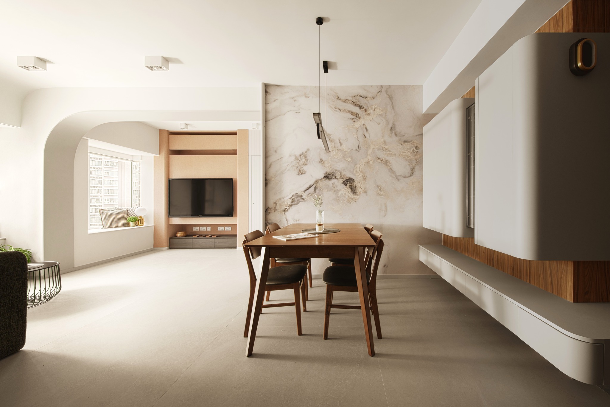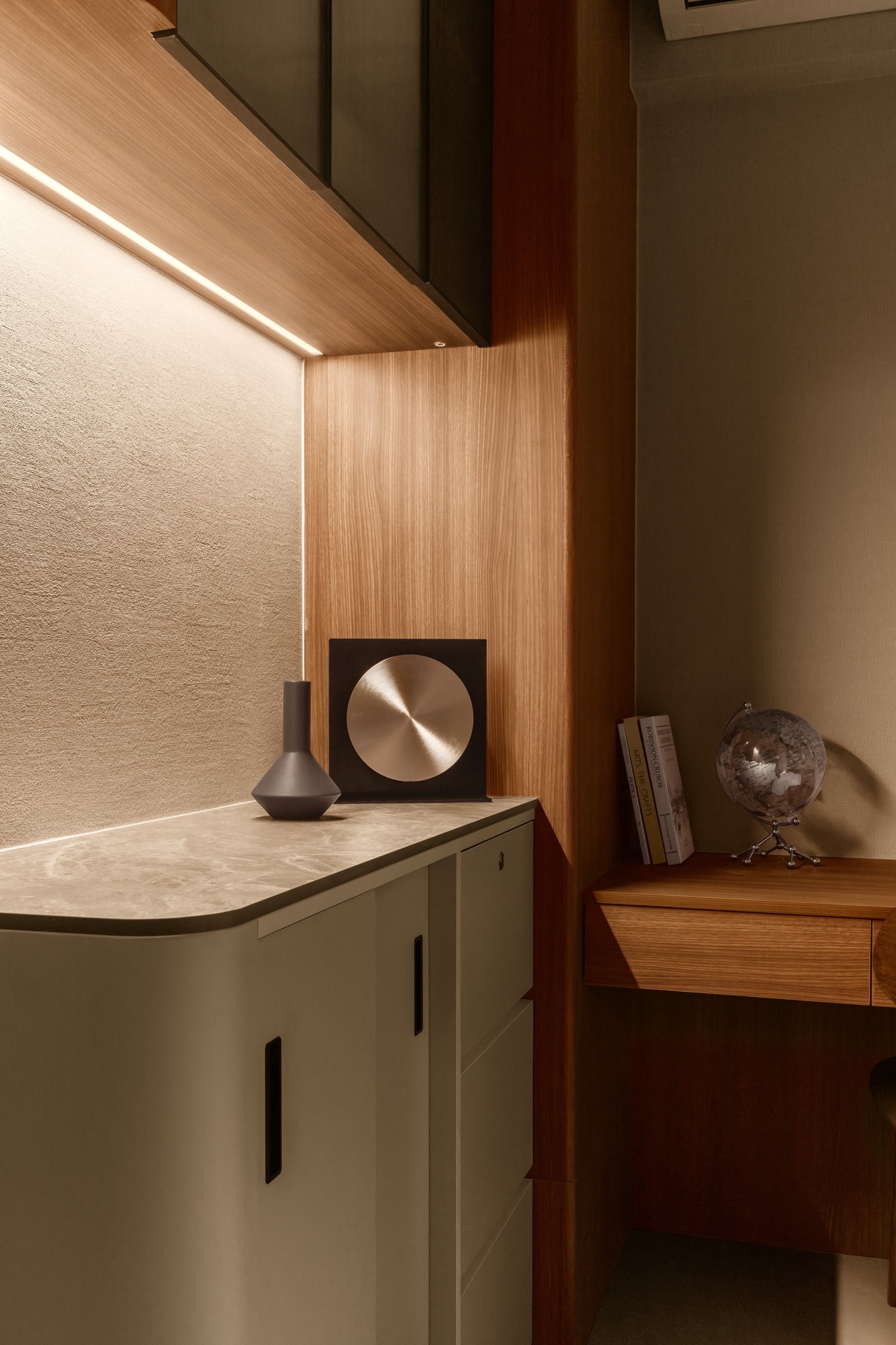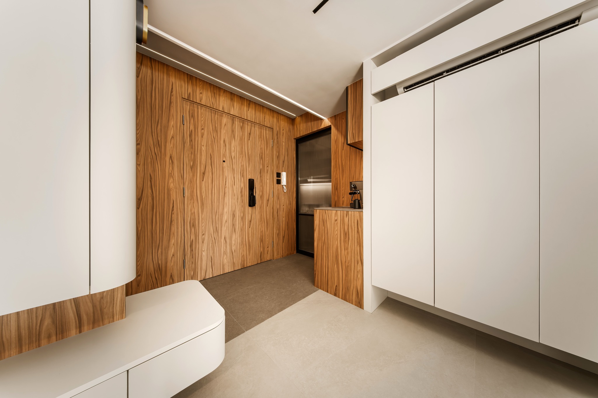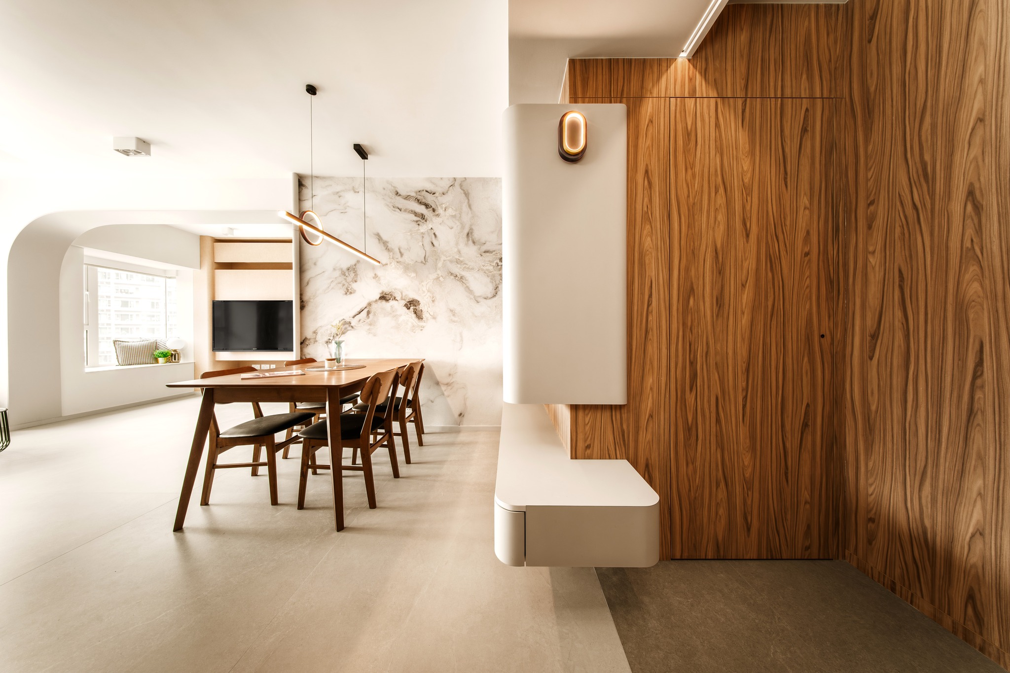 Tierra Verde In a tranquil space, the warm walnut wood blends with the light gray walls, whispering the stories of time. The pristine marble walls resemble a painting, adorned with art that touches the soul, allowing each corner to radiate a unique charm.