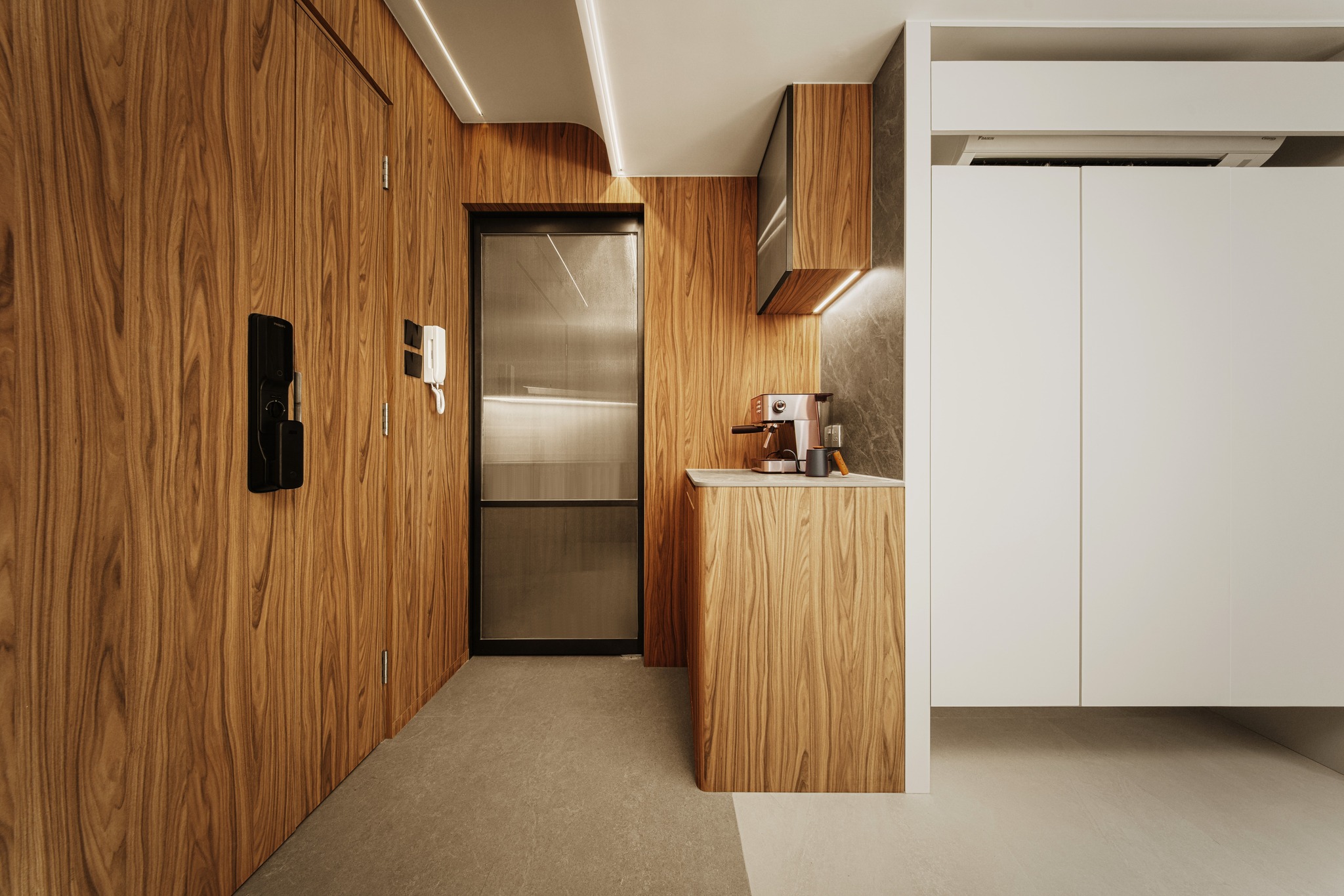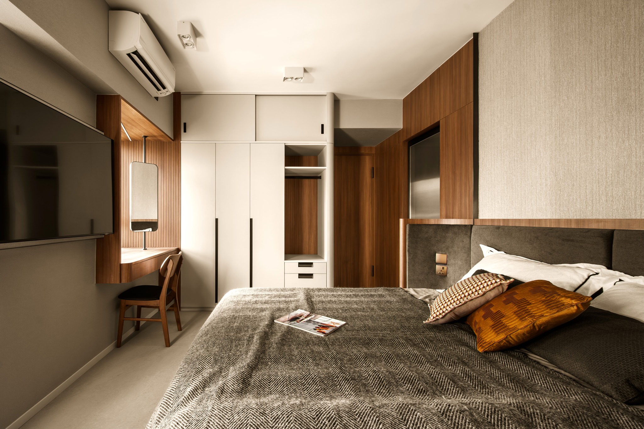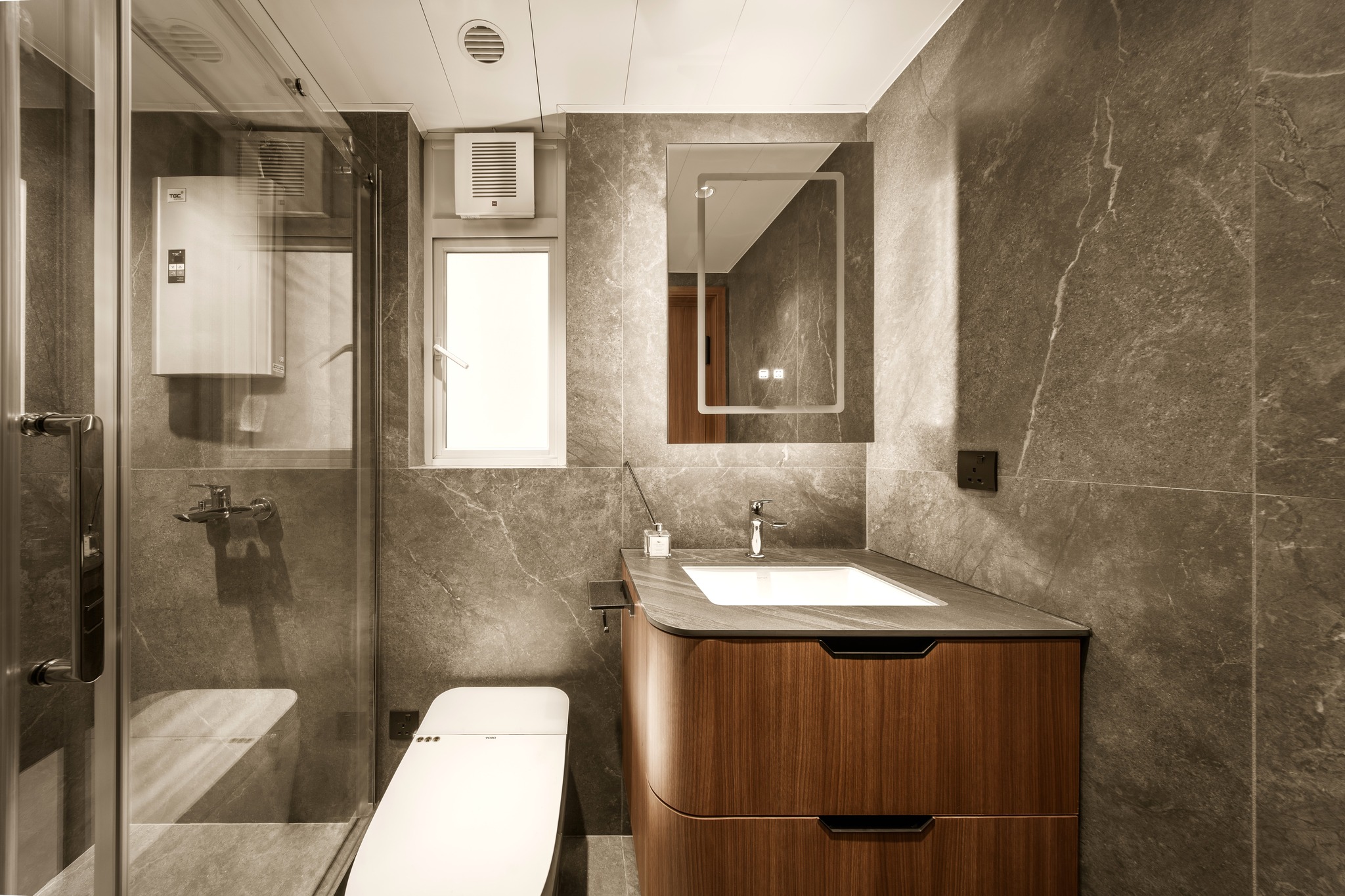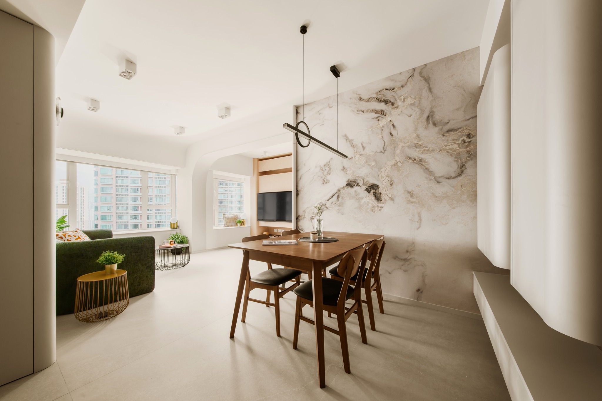 Tierra Verde In a tranquil space, the warm walnut wood blends with the light gray walls, whispering the stories of time. The pristine marble walls resemble a painting, adorned with art that touches the soul, allowing each corner to radiate a unique charm.